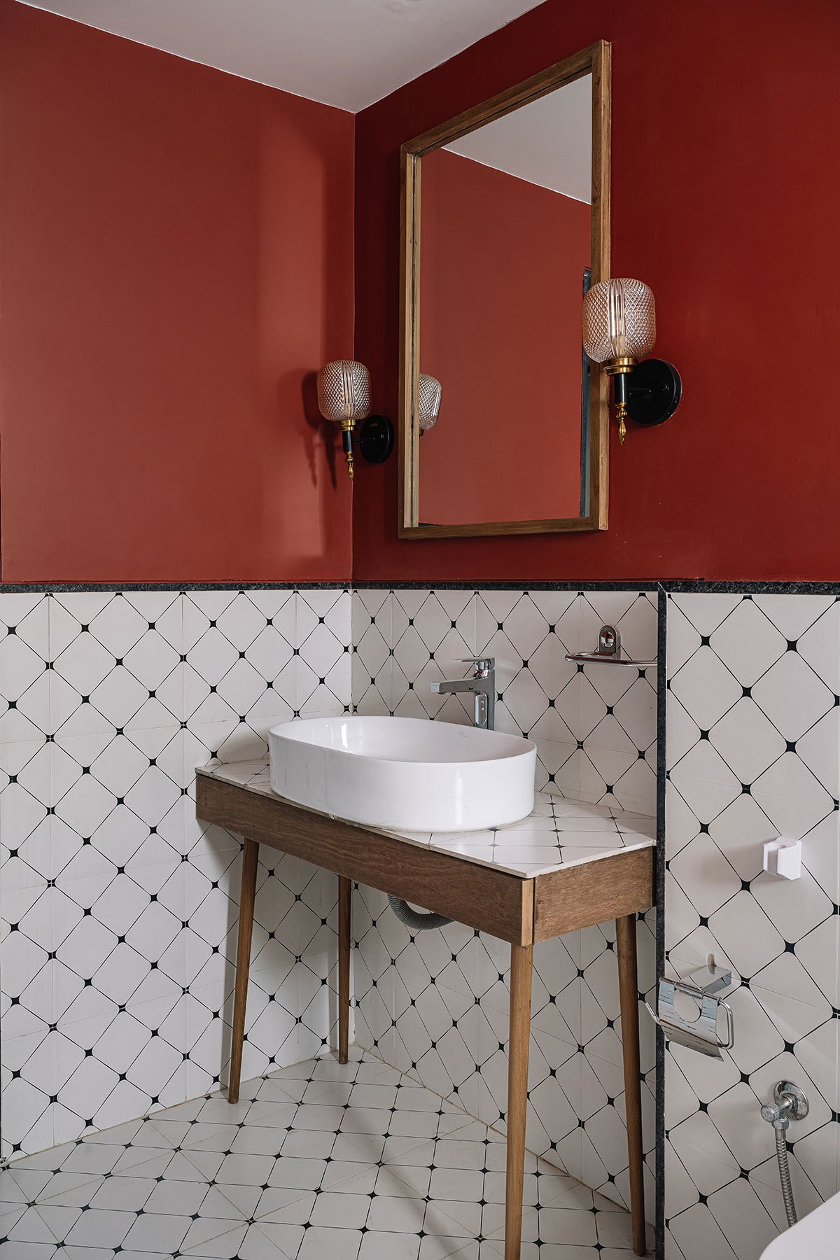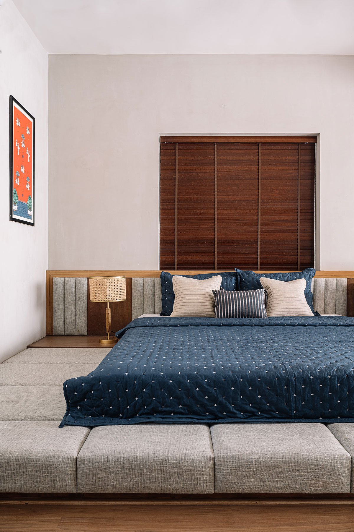 The staircase in the living room leads to the bedrooms on the upper floors providing visual connectivity to the ground floor through louvers. The interiors of the bedrooms have been kept simple with lime plastered walls and wooden flooring where the furniture adds volume and softness against the raw wall. The bathrooms have been crafted on the basis of different themes with textured green marble or patterned Indian tiles and other plain coloured or clay tiles. All doors, windows and louvers are made up of teak wood with natural polish just like traditional Indian homes.