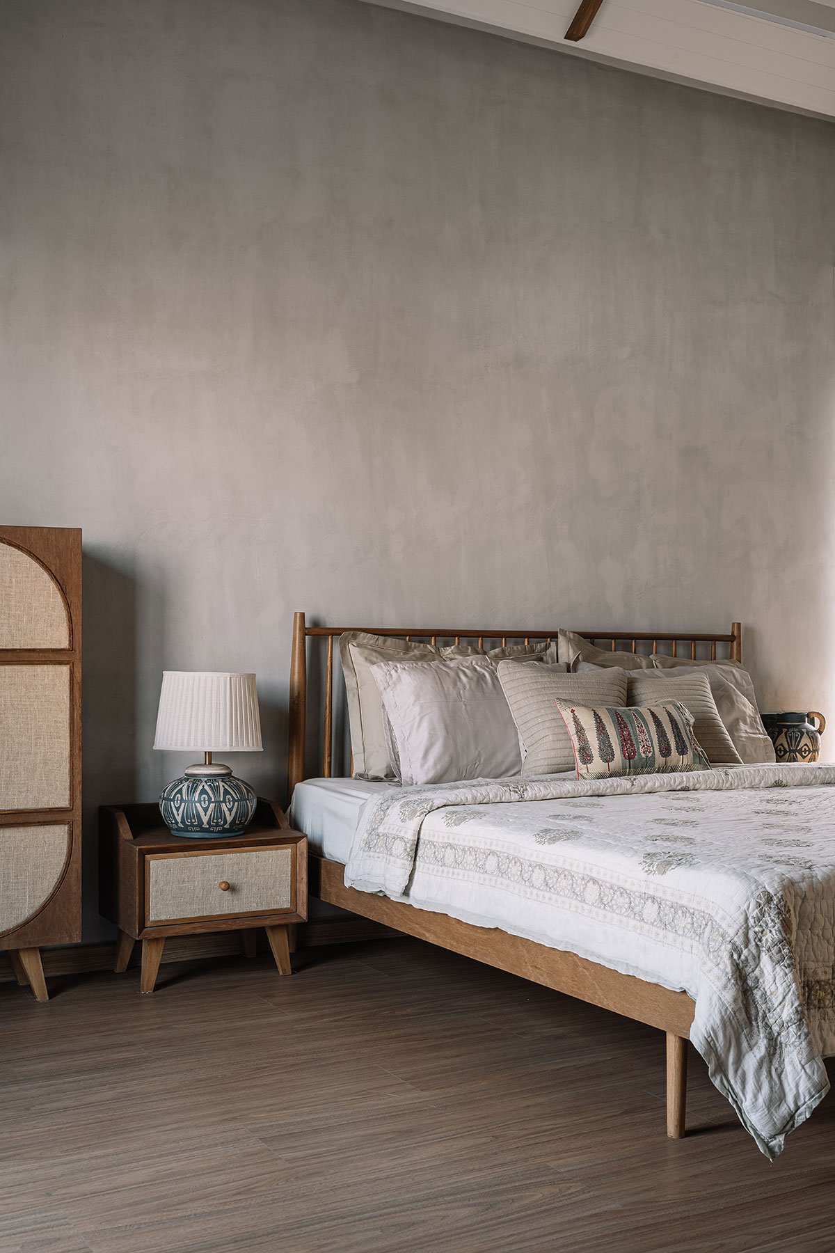 Countrified materials viz. Finished ply, wood, cane and grey textured walls shape up the entire space. The goal was to create a space that is restful and relaxing, and that helps to connect inhabitants to the natural world around them. Large windows and slits are provided essentially to allow ample natural light, and to create a seamless transition between the indoors and outdoors. Application and advancement of eco-friendly materials and optimization of natural lighting and ventilation together structures a sustainable practice.