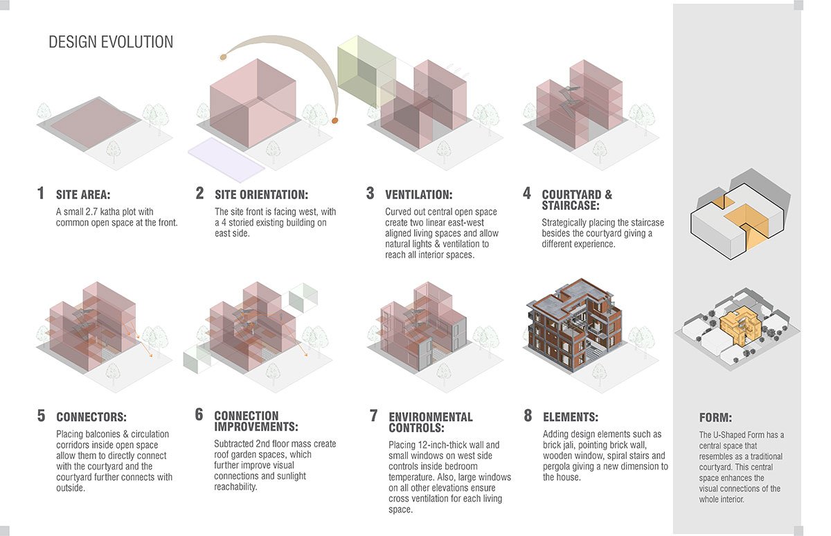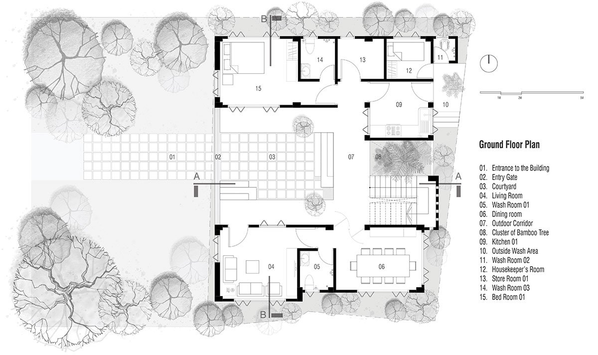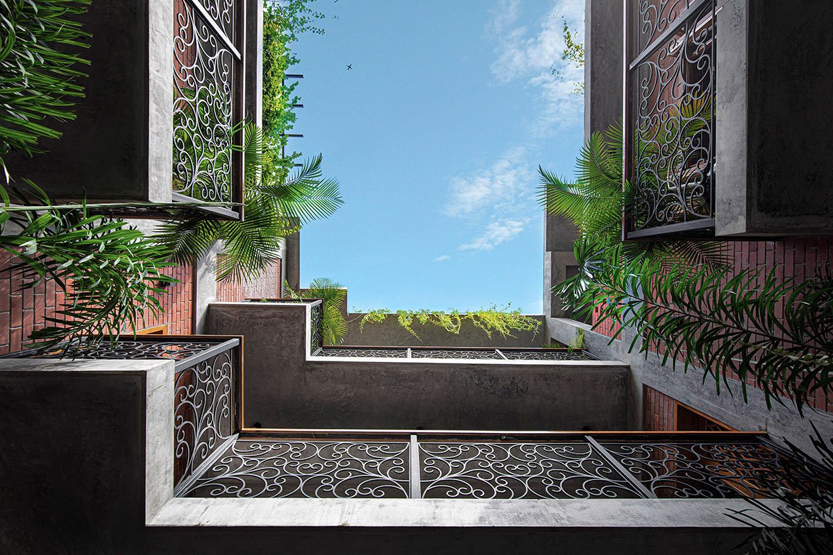 A significant stairway has been added near the existing clustered bamboo tree to connect the building at different levels. Additionally, stairs and all other features are placed around the courtyard to allow for natural light and ventilation to enter all interior spaces. The interior layout of the spaces was designed to represent an approach to combine habitat and nature. Terrace gardens are formed by eliminating mass from the second level, along with greater visual linkages and sunlight accessibility. 12-inch-thick walls and small windows on the west side control the temperature inside the bedroom.