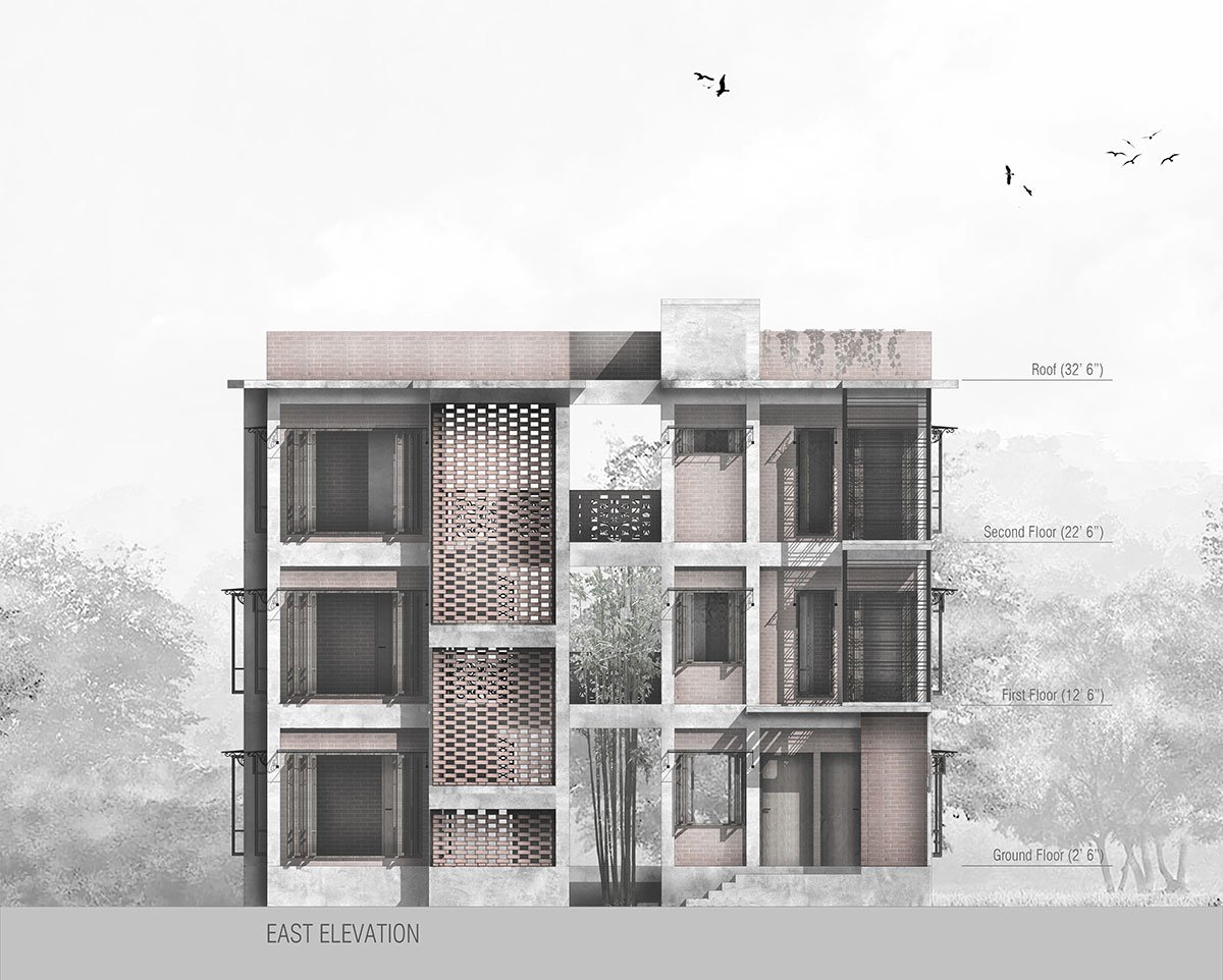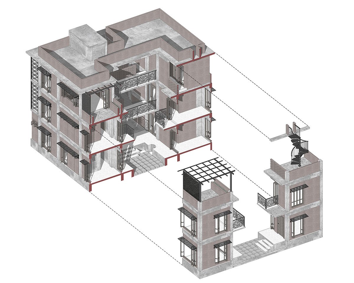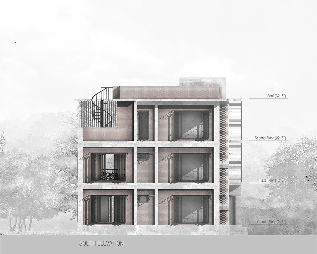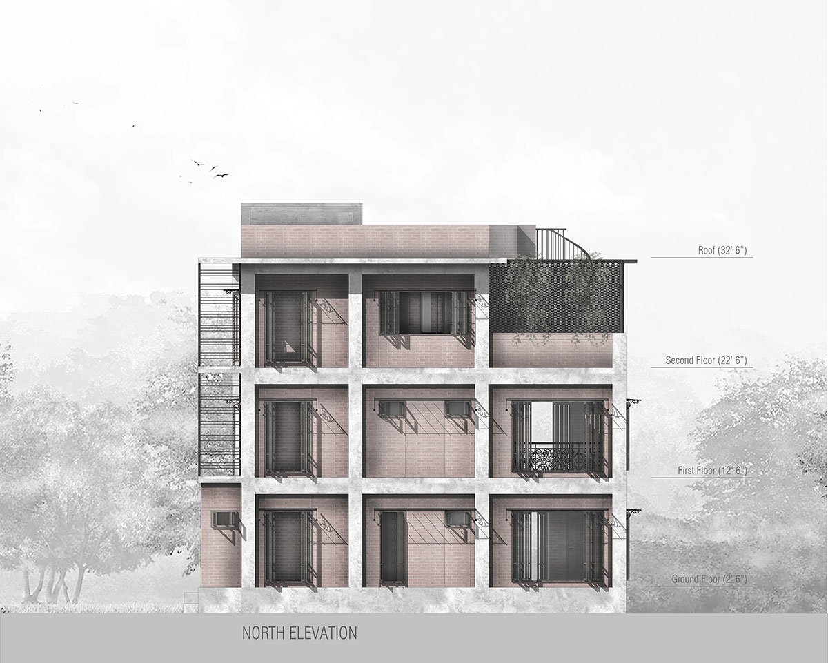 [Text as submitted by architect] The building is in a modest residential neighborhood in Natore district of Rajshahi Division in northern Bangladesh. The 2.7 katha property has a frontage that offers beautiful views of nature and looks out over Kanaikhali field toward the west. Its northern boundary is shared with Ansar Camp. This Kanaikhali field was a deep jungle many years ago, where people were afraid to live due to the danger posed by wild animals. An old woman named Ayna built her shelter and lit her lamp, allowing her to dwell there without fear. This served as the inspiration for the building’s name, “আয়না বুড়ির আদার” (means, Jungle of the old woman Ayna).