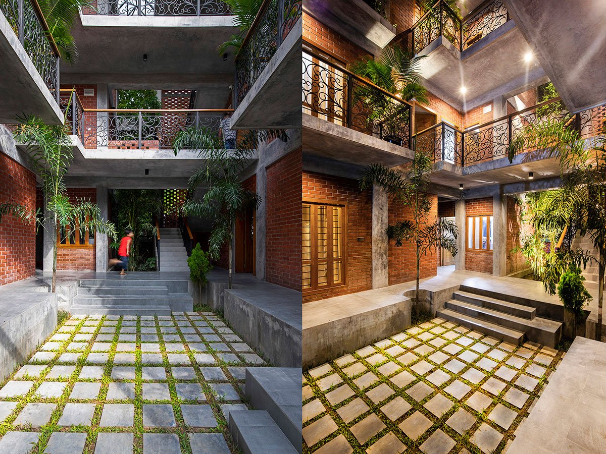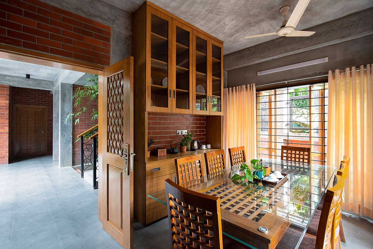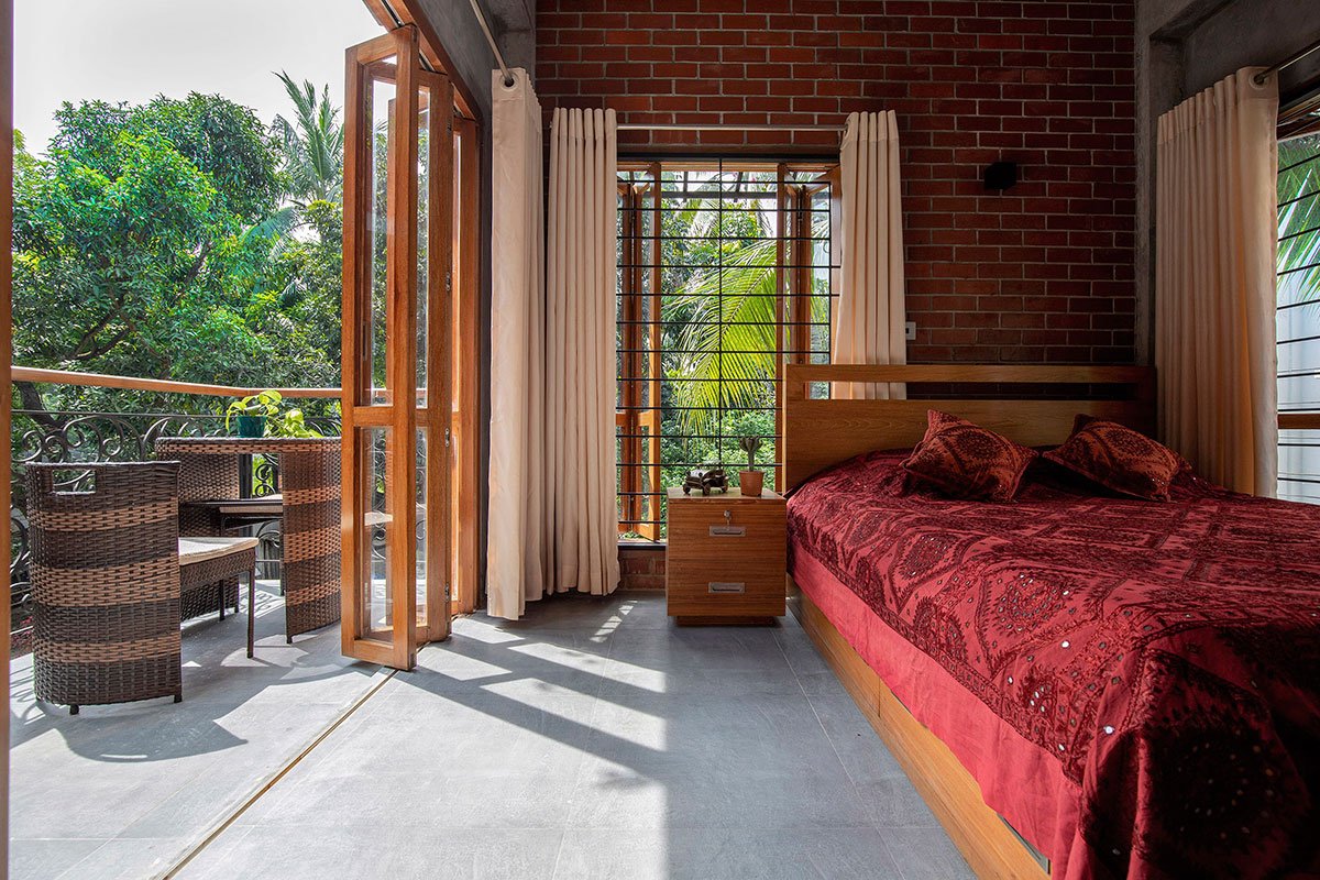 Large windows also provide cross ventilation for each compartment on the opposing sides. The structure gains a new dimension by adding design features like brick-jali, pointing brick wall, spiral stairs, and a pergola. Through the thoughtful use of color, texture, voids, workmanship, the terrain, and the movement of light and shadow, this project aimed to maintain a connection with the climate, light, and nature to enhance visual and tactile interaction with its surroundings.