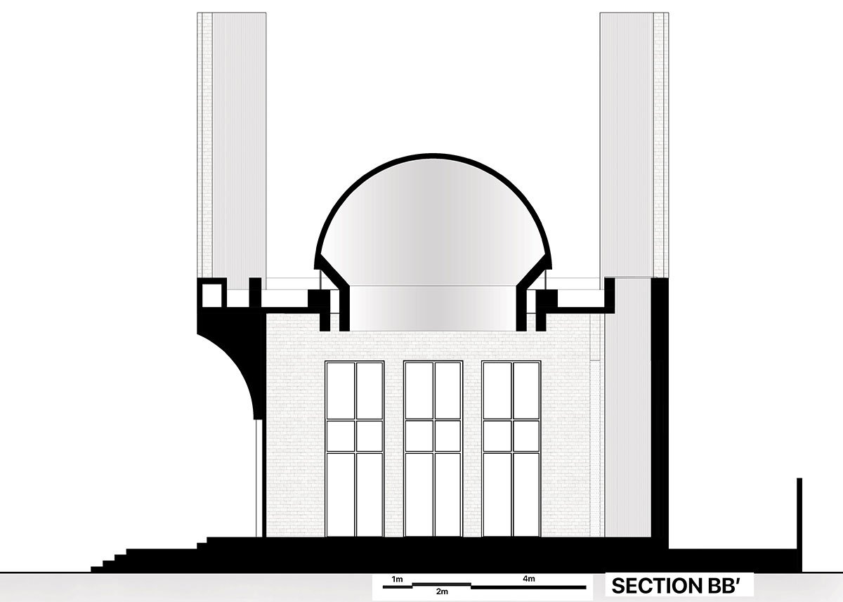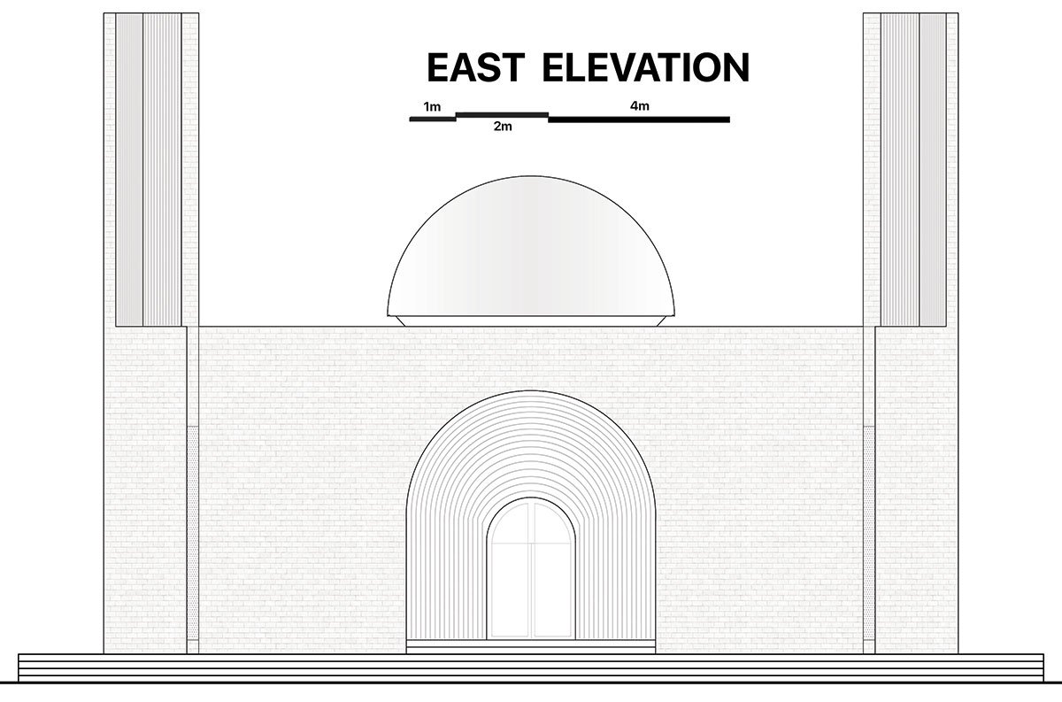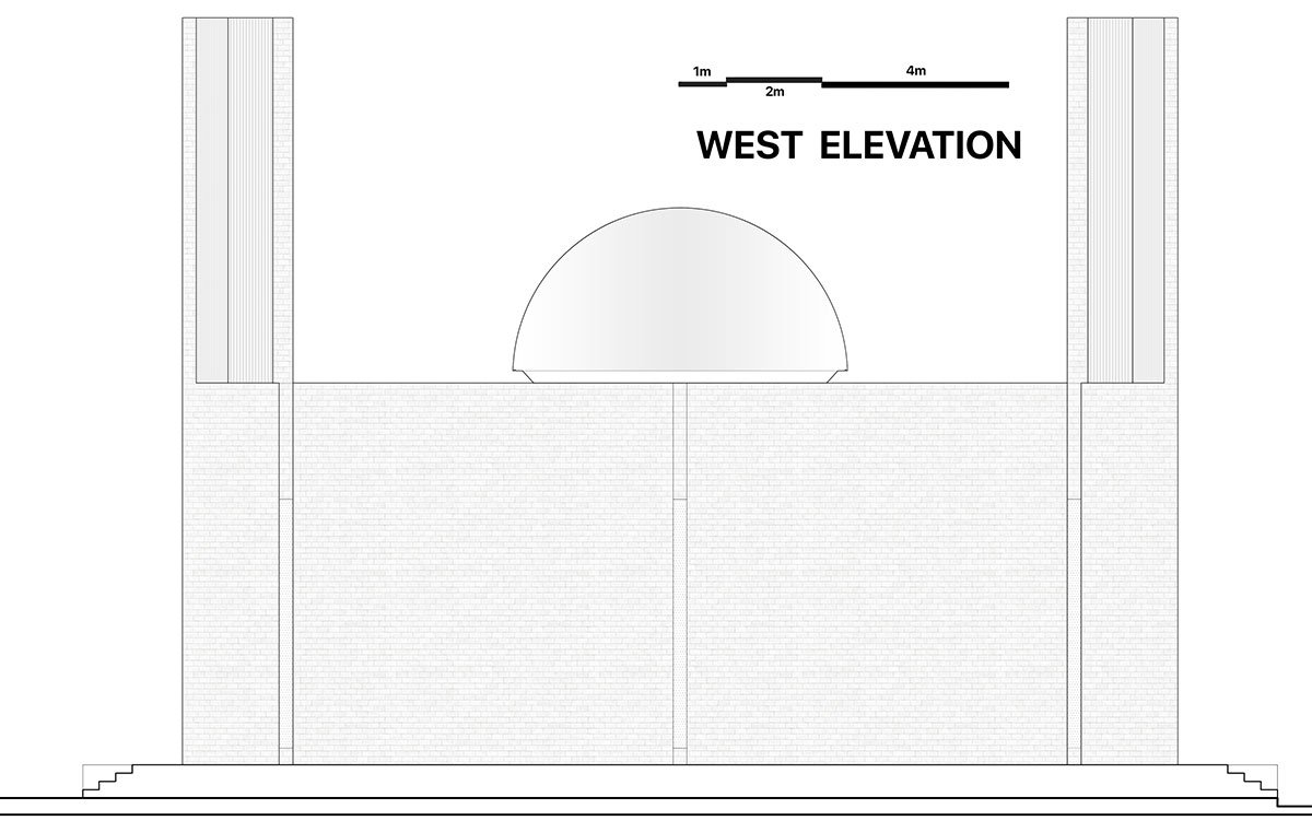 The dome here is a floating dome, allowing daylight through the interior, giving an experience of the vastness of the sky. The minarets are carved as sculptural elements soaring towards the sky. The entrance of the mosque is translated from a typical arch to a volumetric arch making it more inviting.