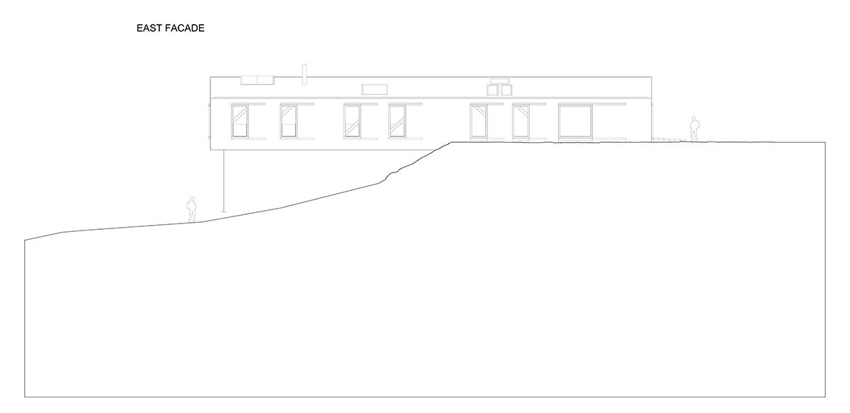 On entering the Barn, one steps into a kitchen and a large dining room. A series of four double bedrooms, each with a separate bathroom and toilet. In the very centre of the Barn, the bedroom sequence is interrupted by a hidden staircase providing access to the garden beneath. In the far, cantilevered end of the Barn is a large living space with windows on three walls, floor and ceiling. The addition of a fireplace makes it possible to experience all four elements on a rainy day. Full height sliding windows and roof lights throughout the house ensure continuous views of, access to and connectivity with nature.