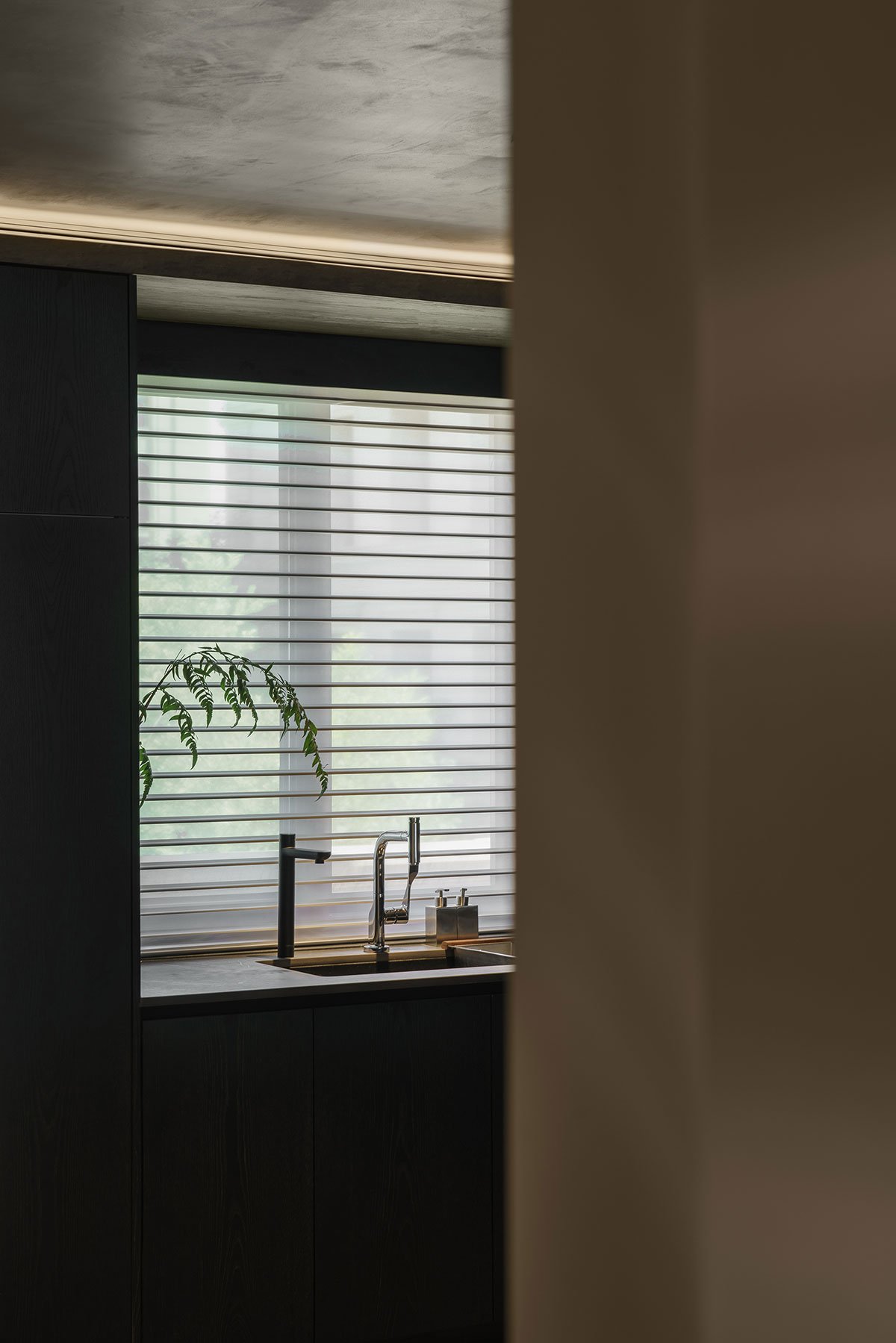 The living room window also echoes with it in the shape of a “column”, reconstructing the rhythm of the vertical walls while ensuring transparency. Translucent blinds and slightly protruding potted bamboo resemble a vivid ink wash painting.