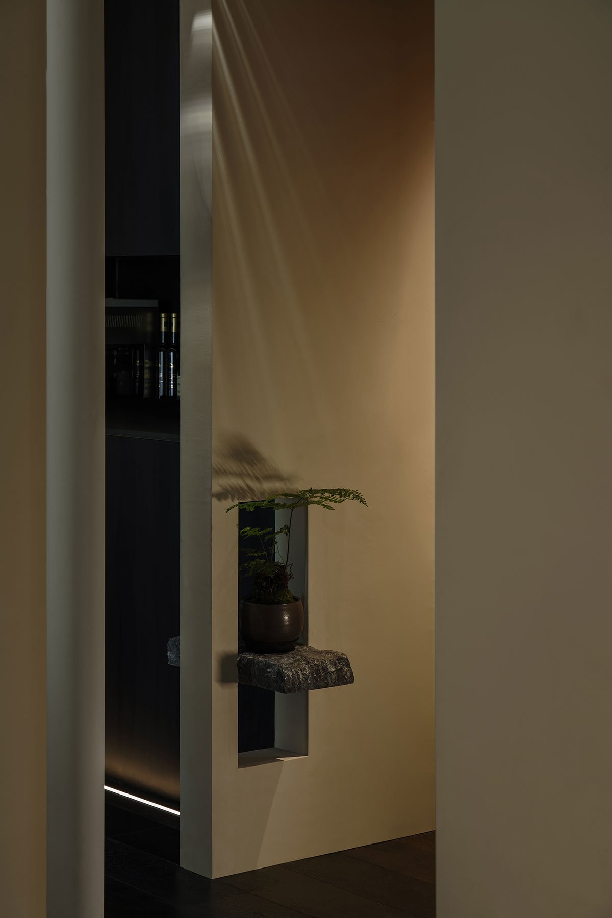 A protruding half-wall at the entrance visually narrows the hallway entrance, contrasting with the subsequent roominess of the public space inside. In the lower part of the half-wall, a small window is opened, through which a piece of black granite marble extends. The texture of the stone is preserved. Placing a potted plant on it immediately evokes the imagery of a wall of mountains and forests. As people move through the space, they view it from different angles, leading to various interpretations of the “mountain”.