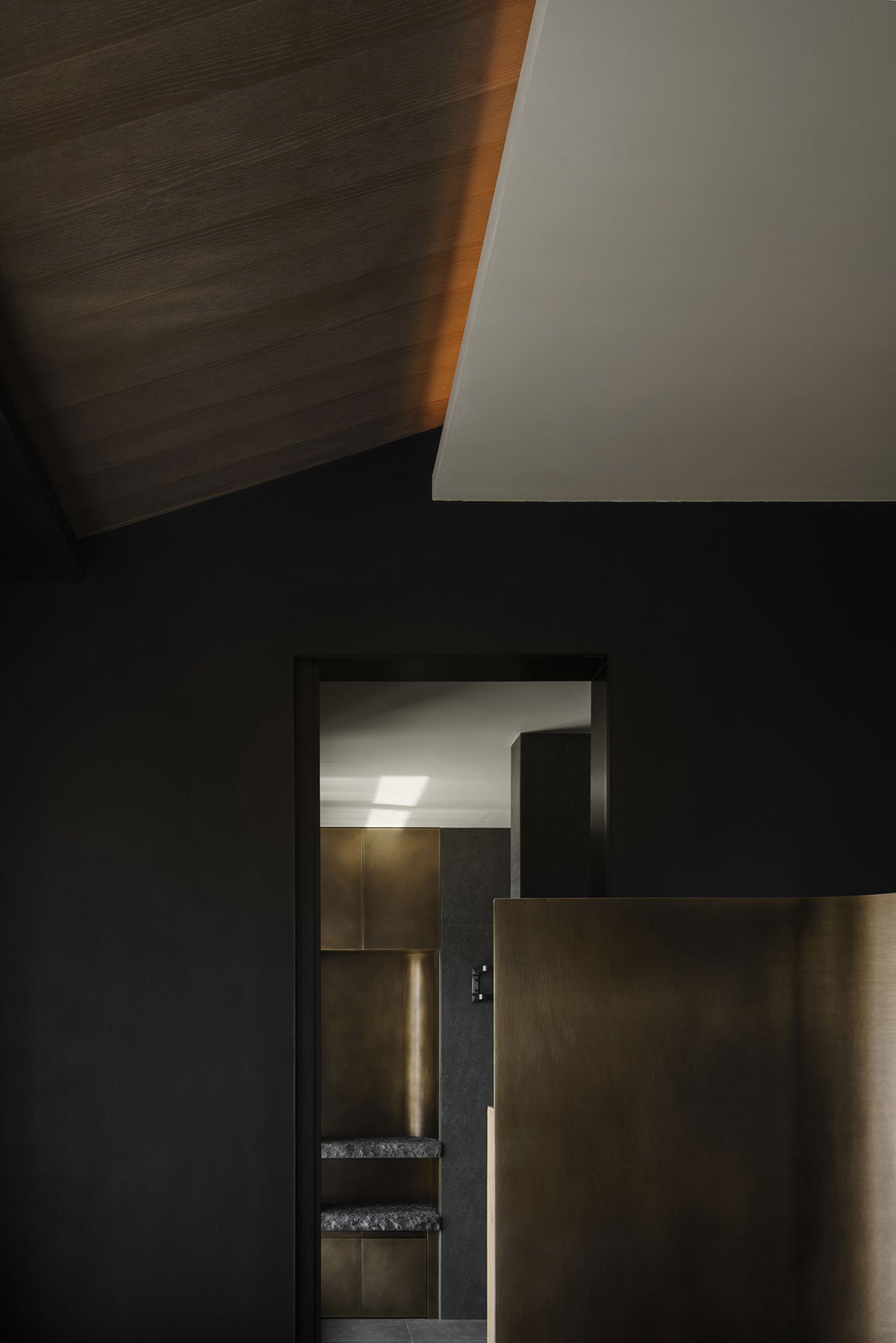 Granite with natural textures is repeatedly used as cabinet panels and shelves, counterpointing with the timeworn wooden boards and adding a touch of rustic charm to the room. The stone, taken from the mountains, returns to the idea of overlapping peaks; the tree, part of the forest, returns to the imagery of lush mountains. These elements reflect the oriental philosophy Cui Shu tries to express in the space.