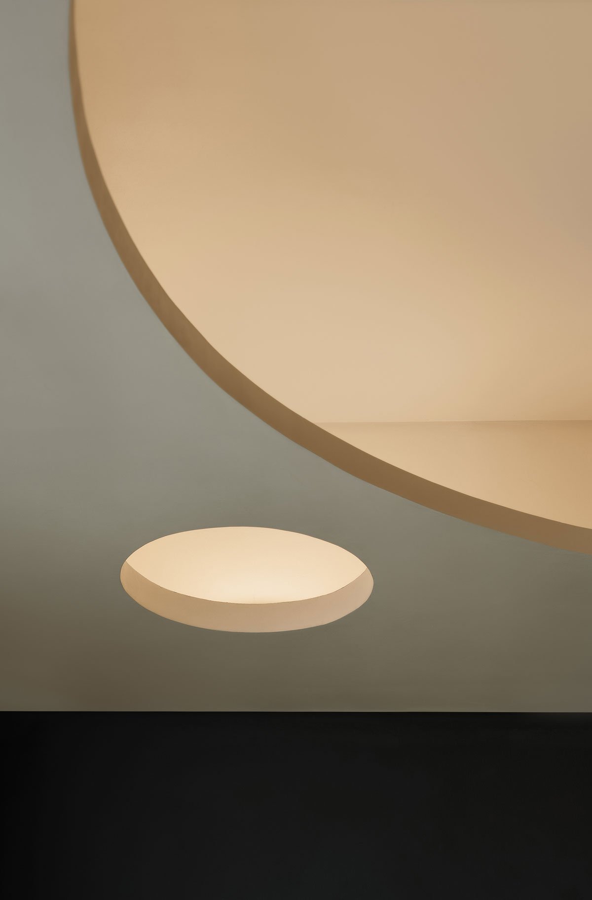 The ribbed glass in the master bedroom serves as a half-wall partition. It opens a new visual dimension vertically, creating a diverting vision of indistinctness when someone walks by. The oblique eaves, the circular ceiling, and the antique open shelves, to some extent, are the extracts and translations of design language from ancient architecture and traditional living spaces.