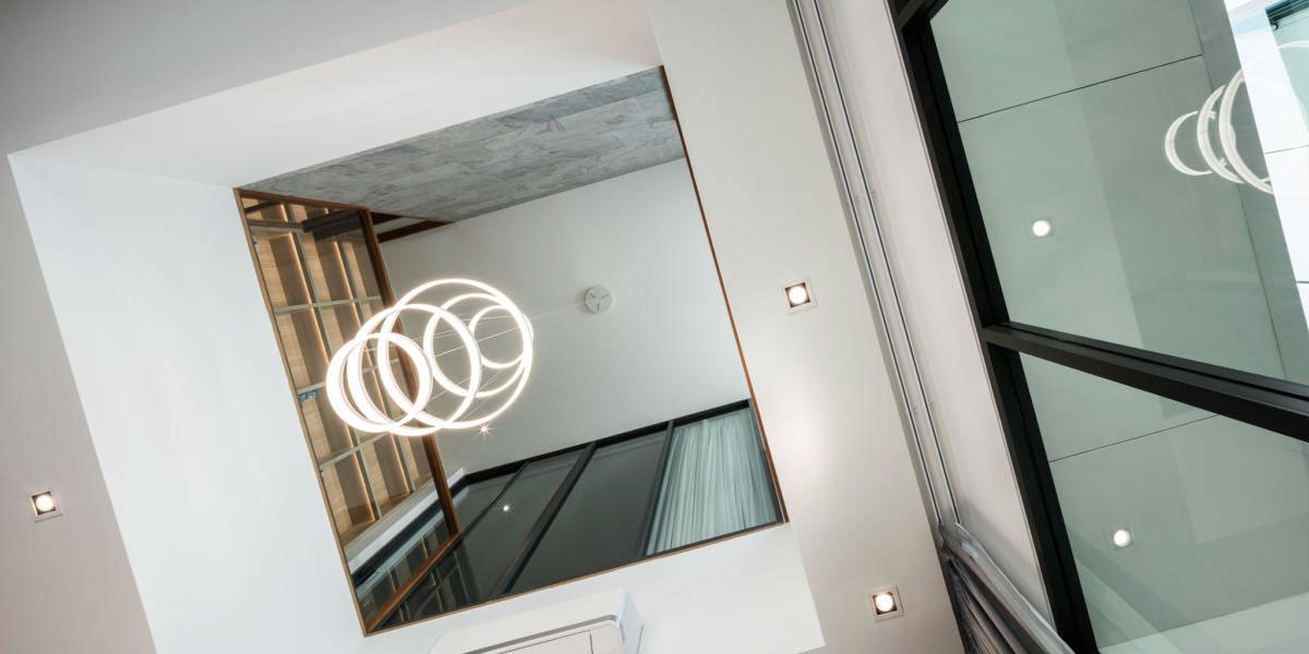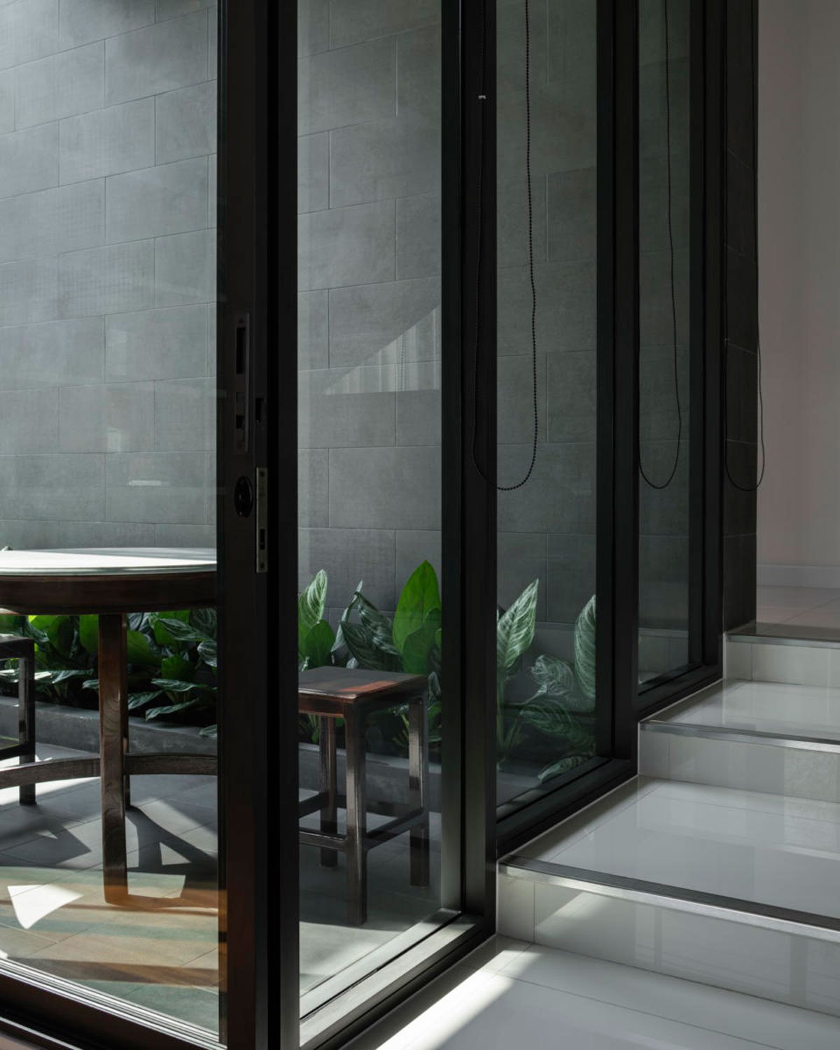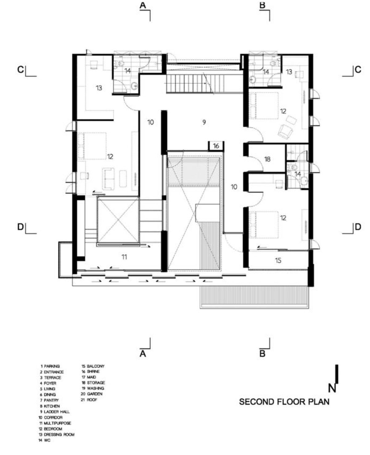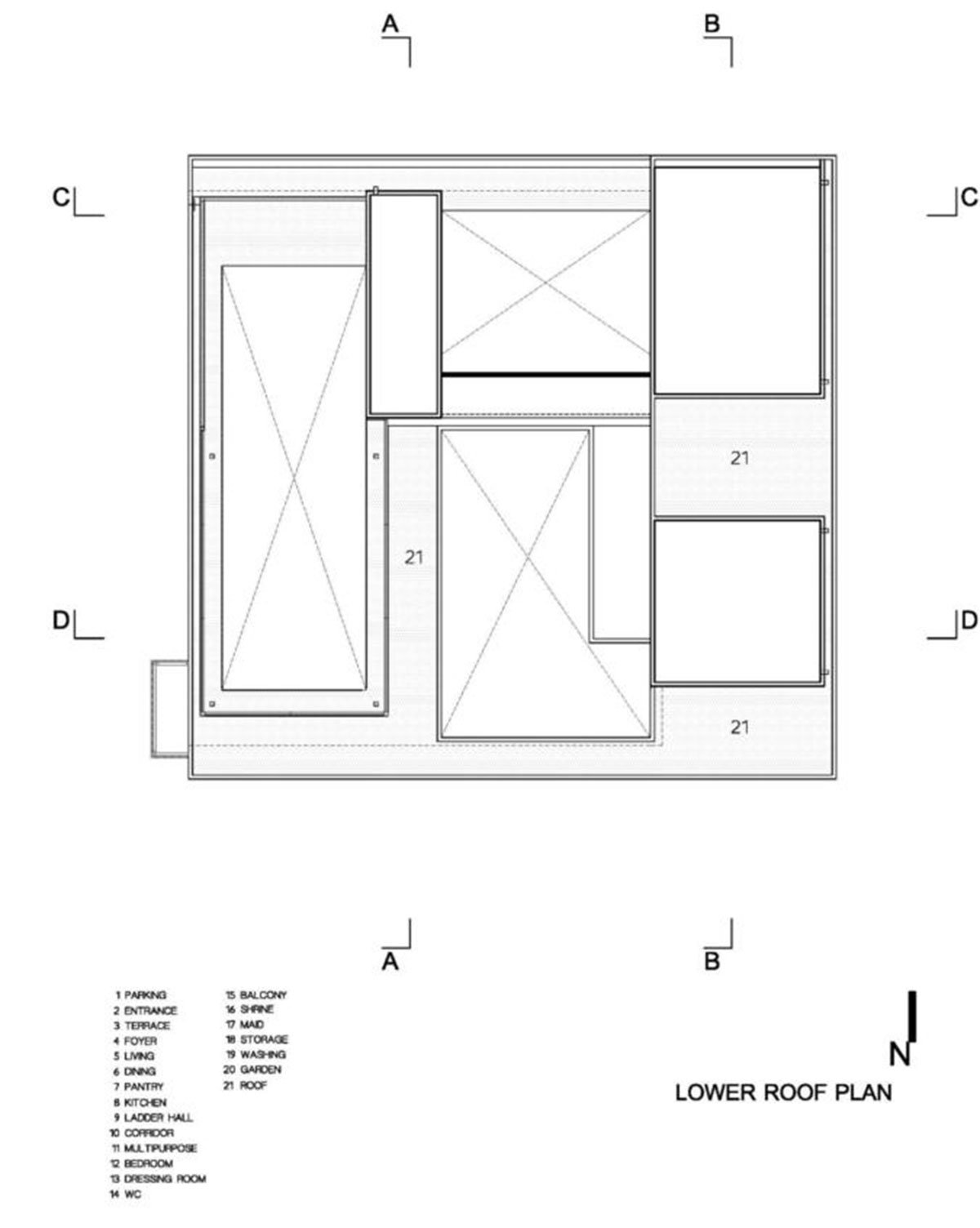 The house consists of spacious living space to accommodate a large family which is ready to increase its members in the future and visiting relatives. There are not too many rooms; this is considered to be a medium-sized house of four bedrooms. The upper floor is occupied by the three main bedrooms and a praying room which, in the Buddhist way, must be placed at the centre, dividing space into two sides, and above all other rooms where laypeople live. The other bedroom on the ground floor is for the convenience of an elderly mother, and for her safety from different floor levels. The rest is a space for sharing: a dining room and a pantry that connect to each other via a main staircase adjacent to the background, pushing a living room that can receive guests in various occasions to the front corner, according to the desire to see the extreme privacy and sharing blended in this area. This also allows this room to have no ceiling board, creating a vertical open space that touches the other vast empty space between the master bedroom and the study on the upper floor, sequentially making a collage of private and shared spaces between the upper-floor bedrooms and the ground-floor living/guest room: an “in between” which both separates and embraces the multi-function space.