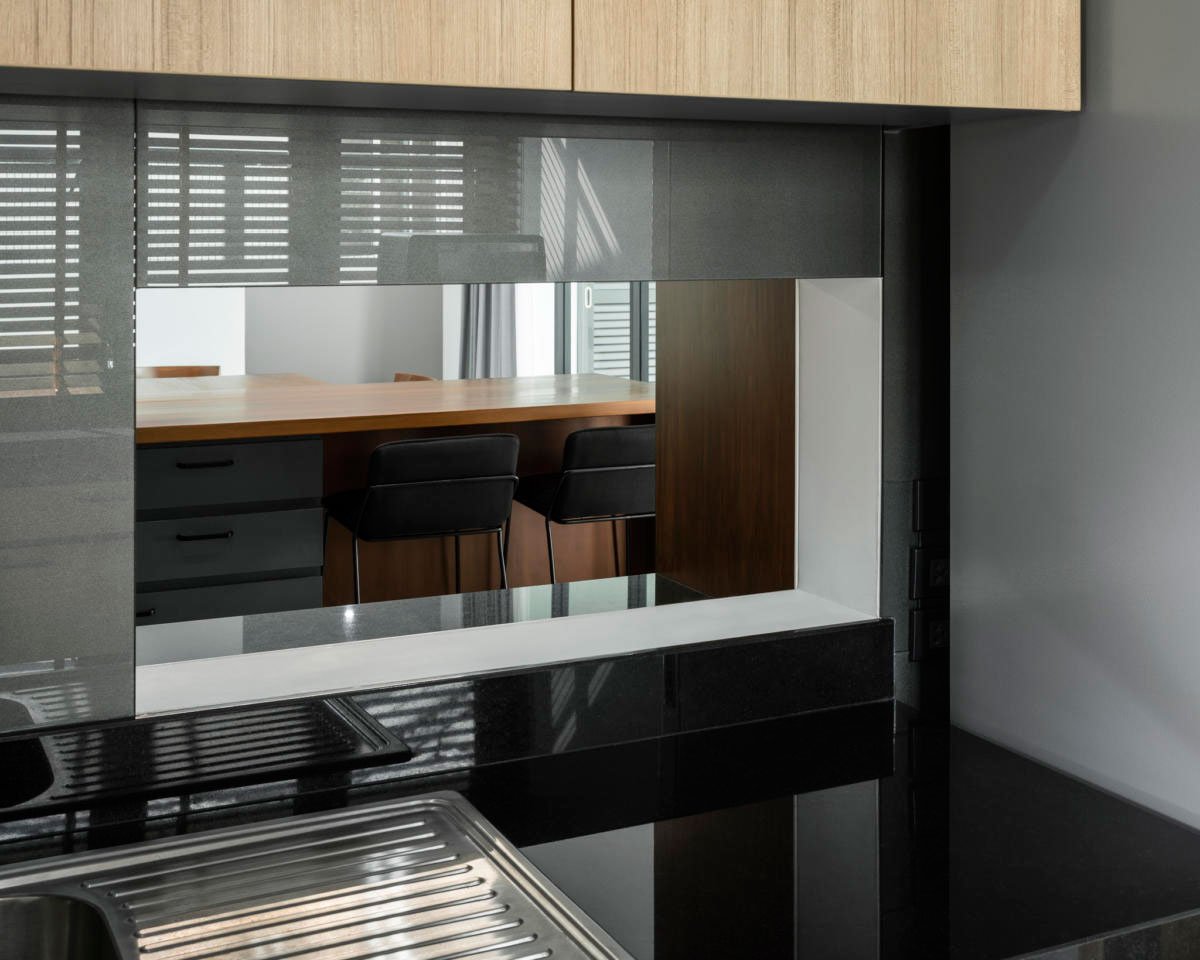 Of course, here, a parking space, which is said to be crucial in urban life even more than a kitchen since it is easier to cause dispute between neighbours than the smoke from grilling stove in the backyard, is not forgotten. Thai kitchen, washing area, laundry space and maid’s room size of three single beds putting in a row are all set to be at the back for the convenience of the service. Maybe this area is the least extraordinary of the house.