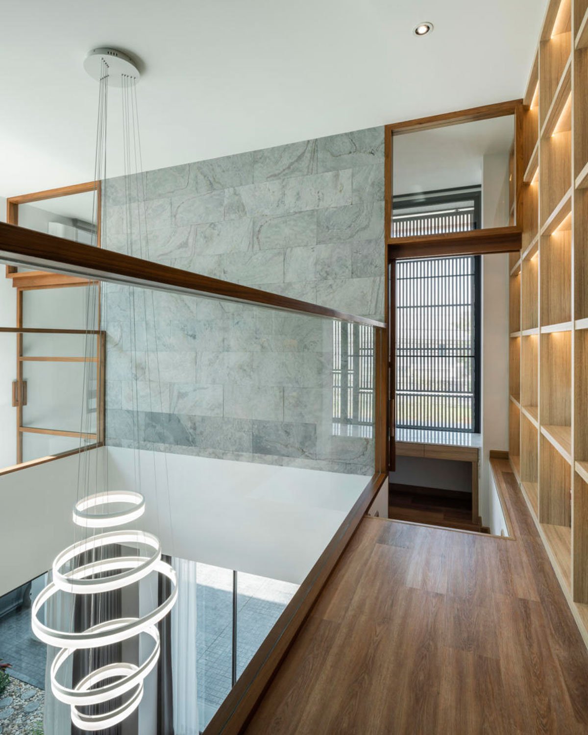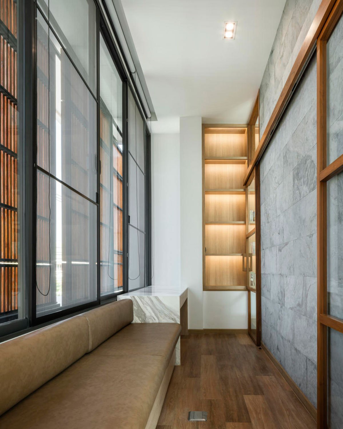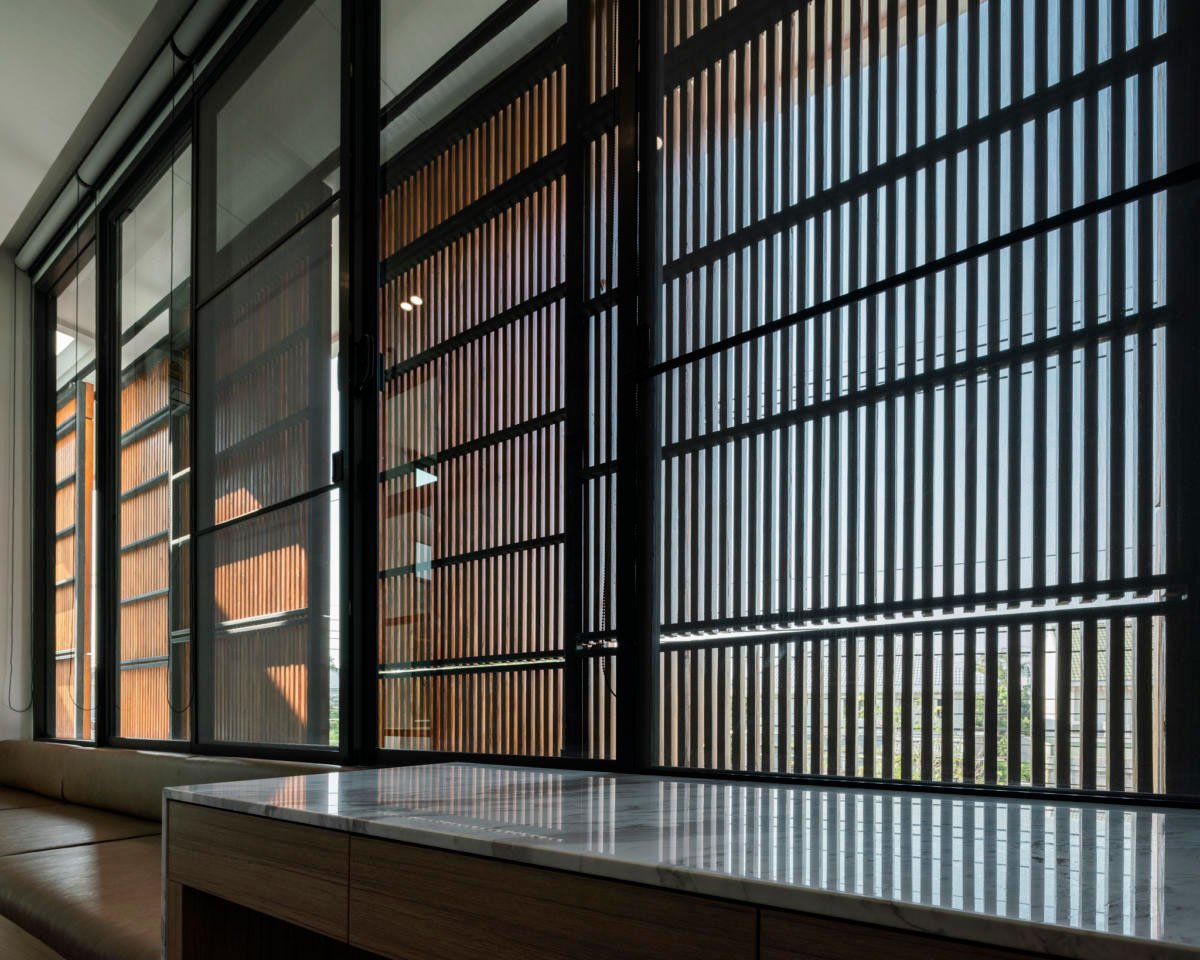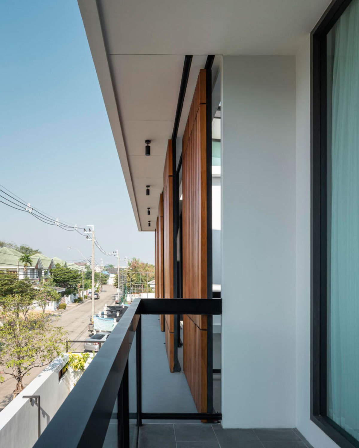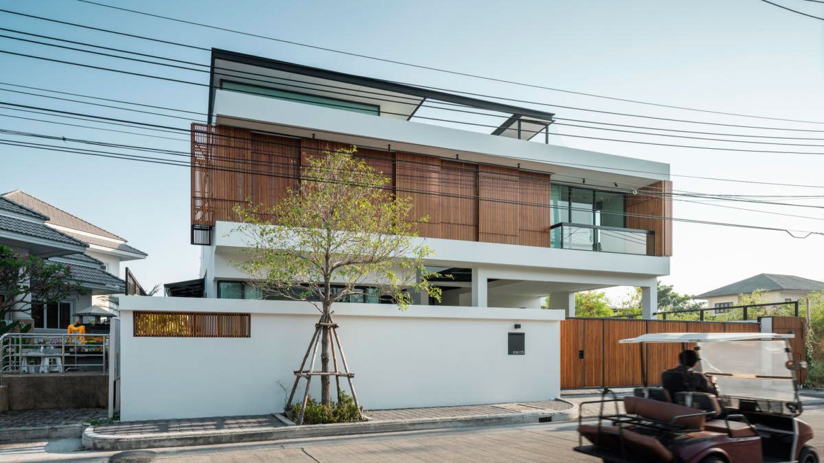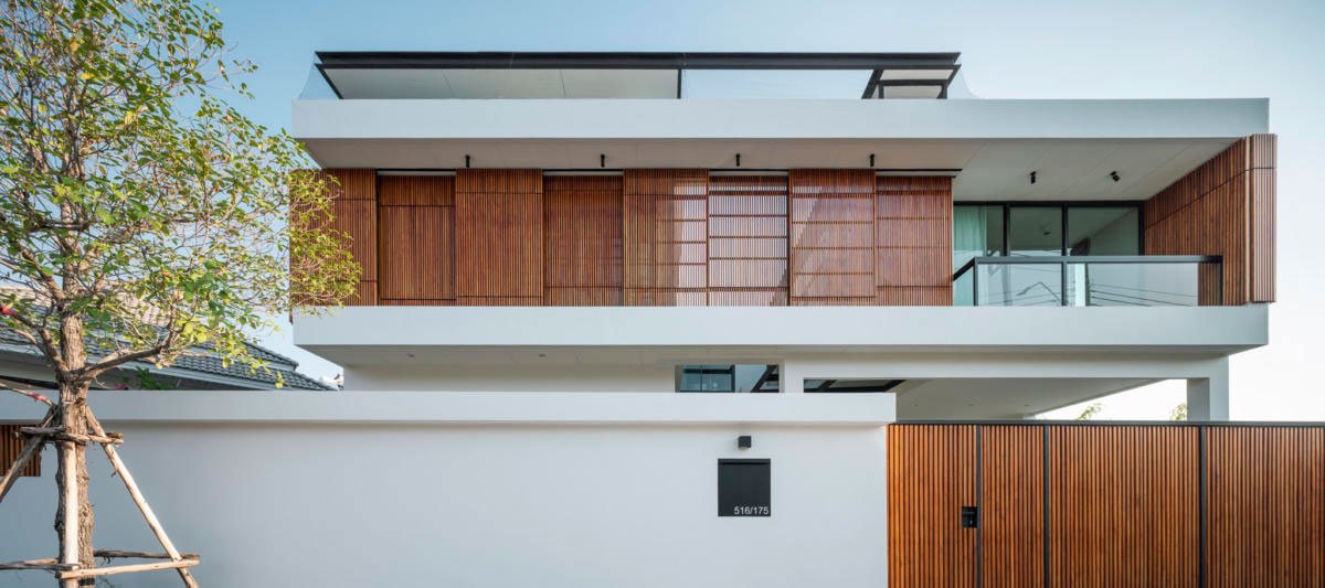The house’s external features are constructed from contemporary methods and materials, using sliding panels of wooden battens as external curtain to control visibility. Half of the roof is front lifted whereas some parts are higher than others for visual diversity. The top part creates new proportions and unexpected utilities for this two-story house, with wide length 16 m. On the total utility area of 430 sq.m. The house adjacent to the clubhouse of the housing estate project while on the other side and at the opposite side face some open space that create new self-defined personalities amidst all existing limited conditions.