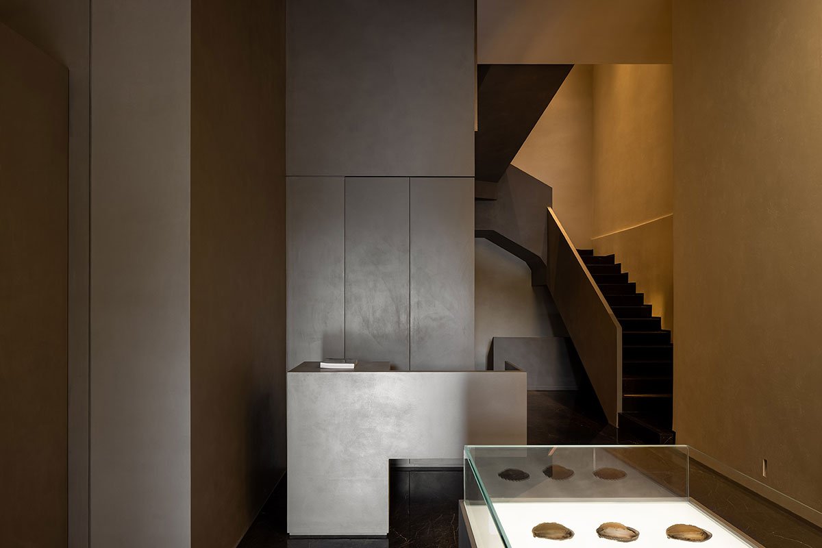 Irregular geometric blocks of varying forms create an impactful visual effect in the small-scale space.The main function of the ground floor space is for product display, with the structures emphasizing a sense of strength. The various areas are seemingly separate, yet interconnected to offer a holistic sensory experience. The free form of structures gives the space a sense of conflict and harmony.