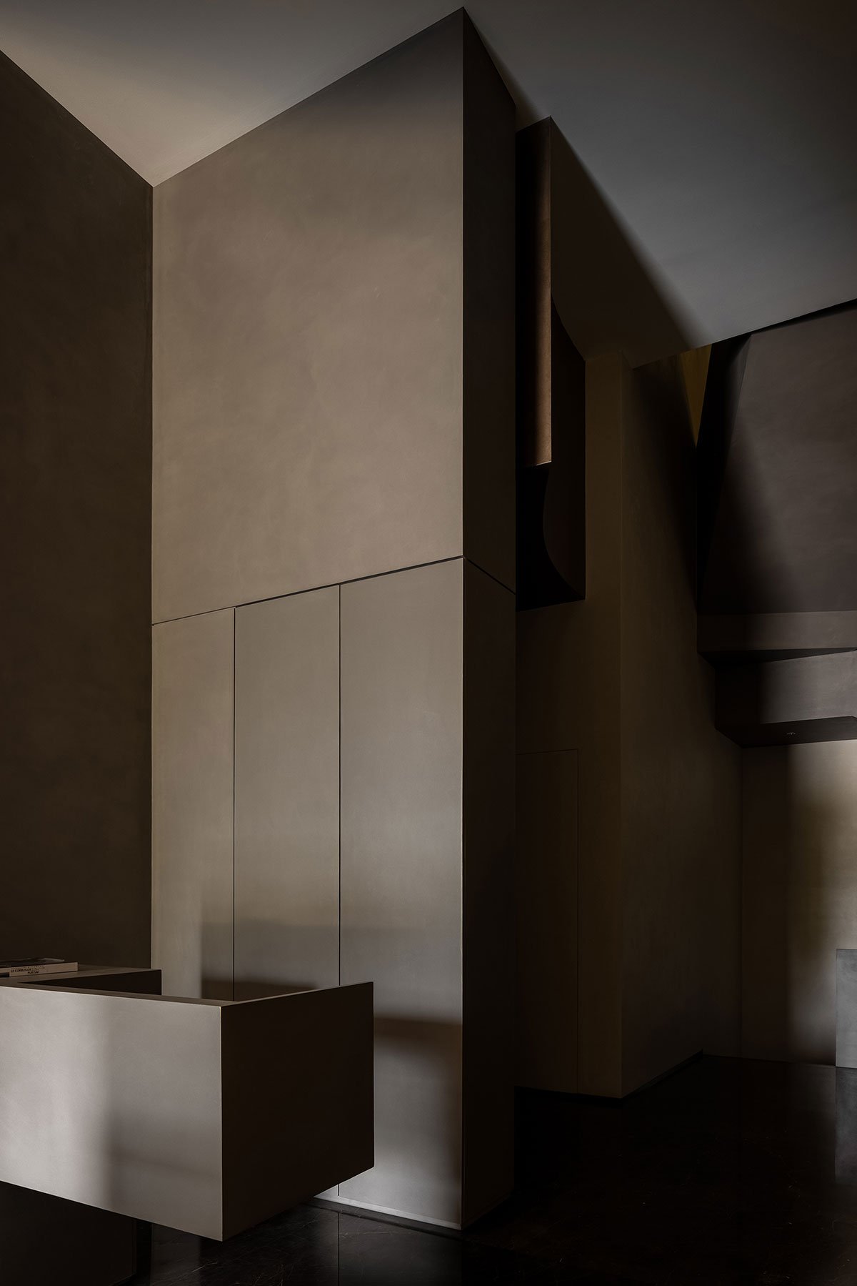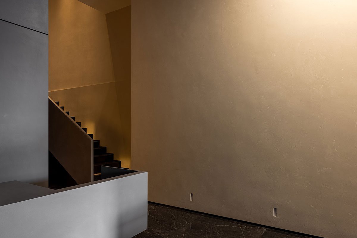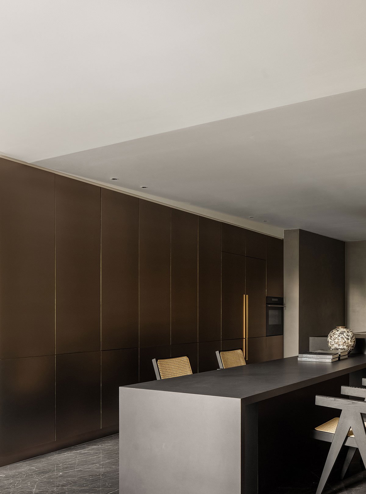 Walls clad in stone-texture paint contrast with the metal materials, injecting a sense of luxury into the comfortable space. Soft light accentuates the sense of weight in the space. The “floating” blocks strike a balance between heaviness and lightness, adding fun to the space.