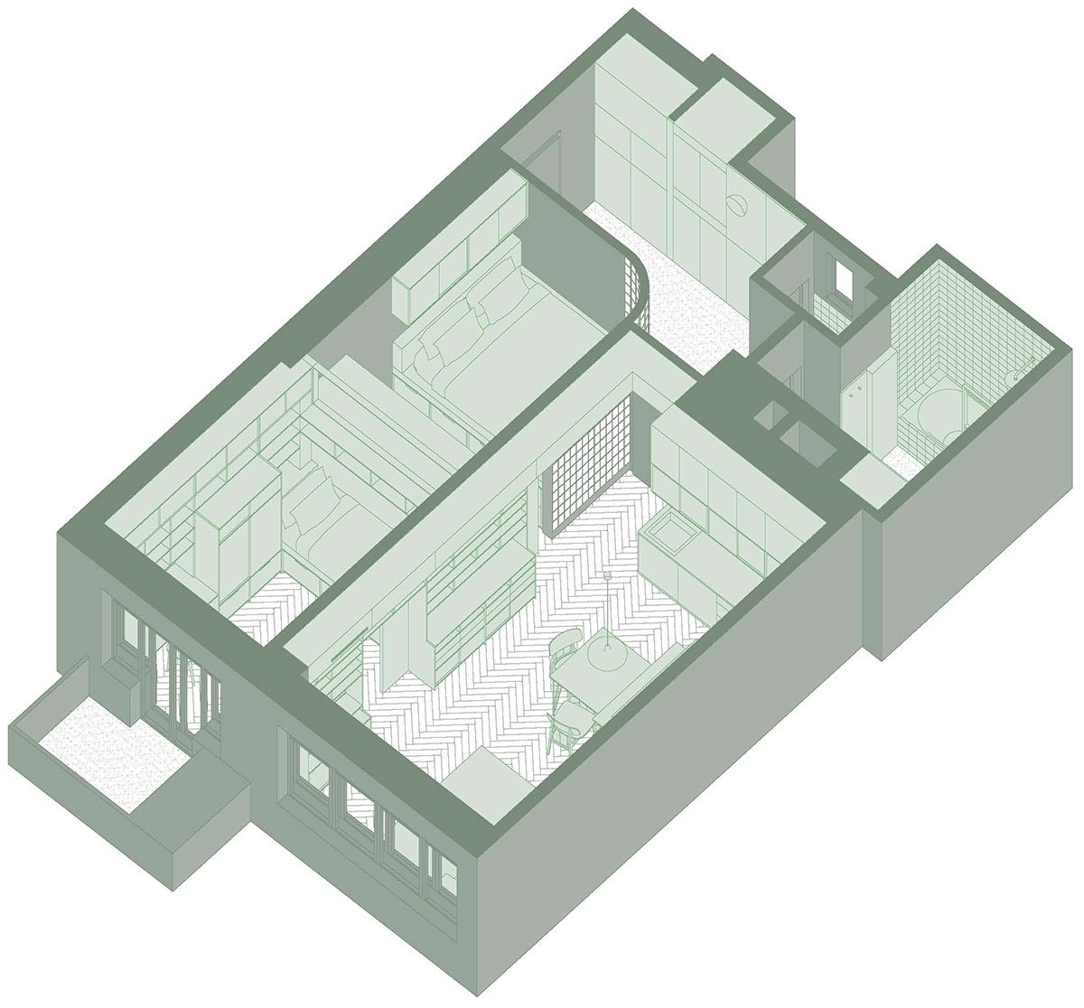 Concept: The existing layout included an entrance area, bathroom, living space, and one bedroom with balcony doors. The design focused on maximizing the use of space through built-in furniture, which not only separates different parts of the apartment but also provides storage solutions. A key feature is a long bookshelf that adjoins the original partition wall. This bookshelf contains two openings: one leads to the children’s room, which is wider, and the other to the parents’ bedroom, which has a standard width and offers greater privacy. Between the two bedrooms, a longitudinal window was designed to ensure natural lighting in the parents’ bedroom.