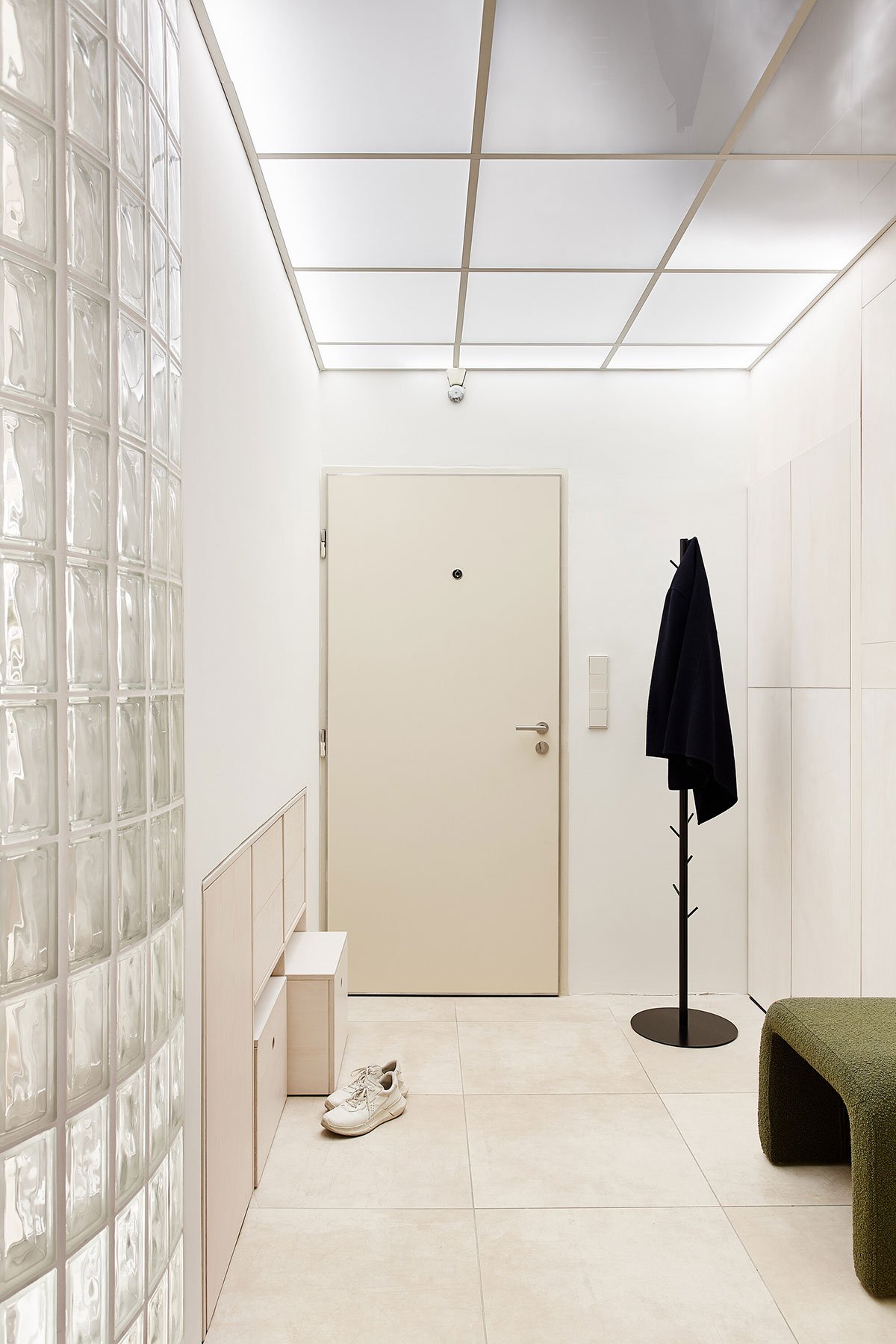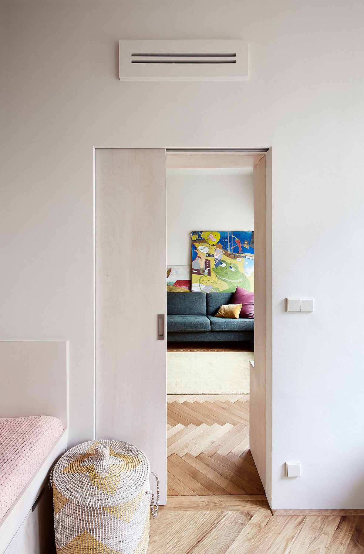 Technical solutions: A ventilation system with heat recovery (recuperation) was installed, hidden within built-in cabinets and ceiling panels. This system ensures a sufficient supply of fresh air, particularly for the rear bedroom, which does not have an openable window facing the façade. The recuperation system significantly improves indoor air quality.