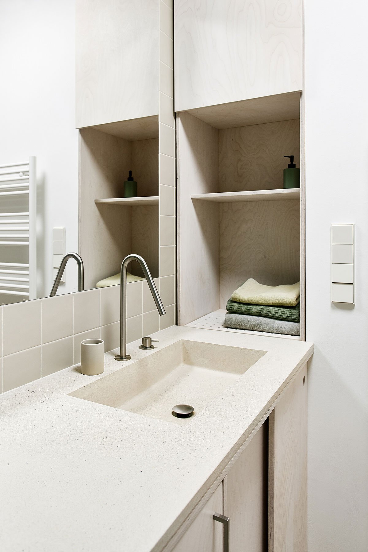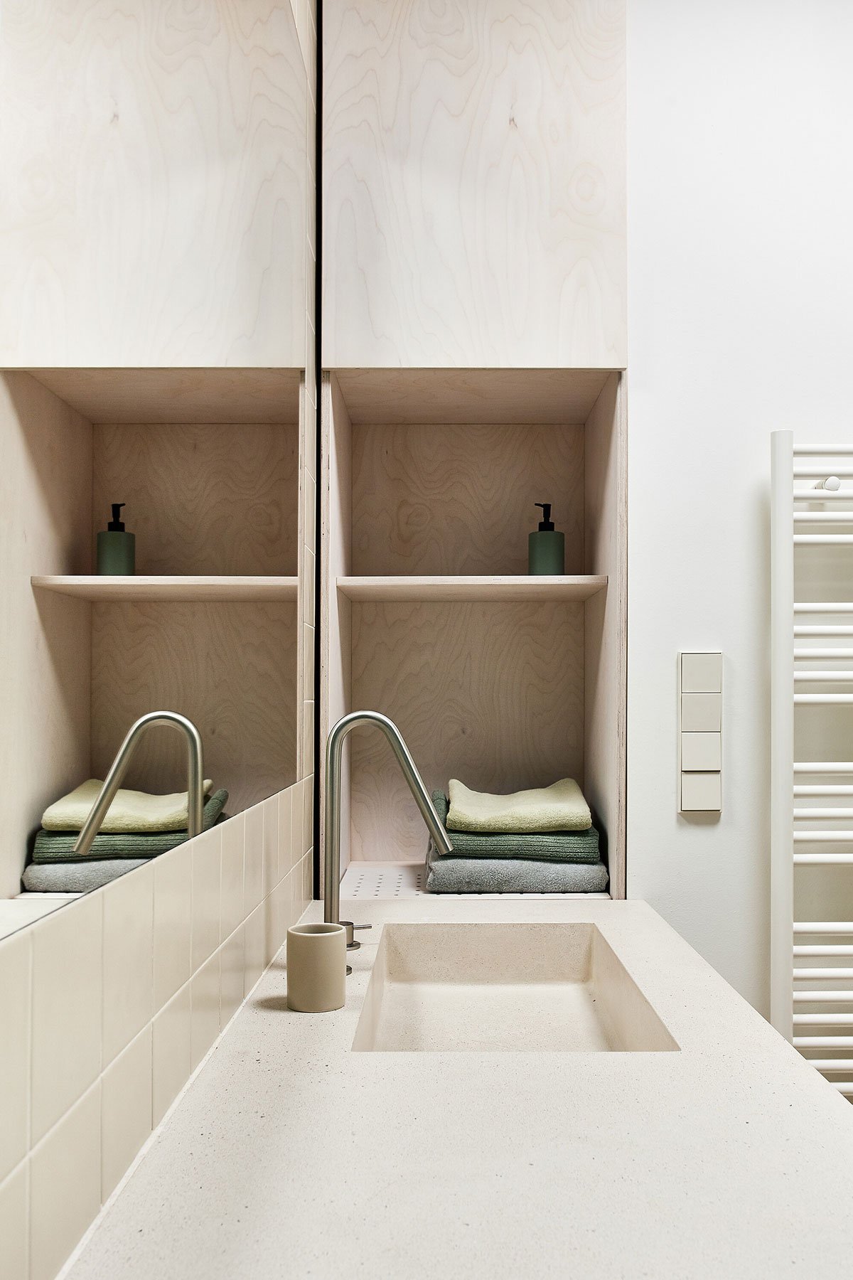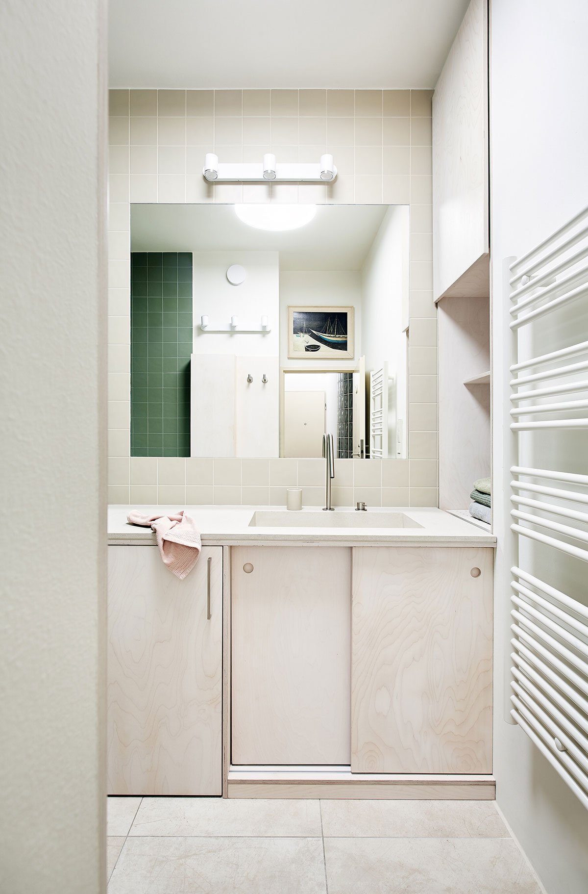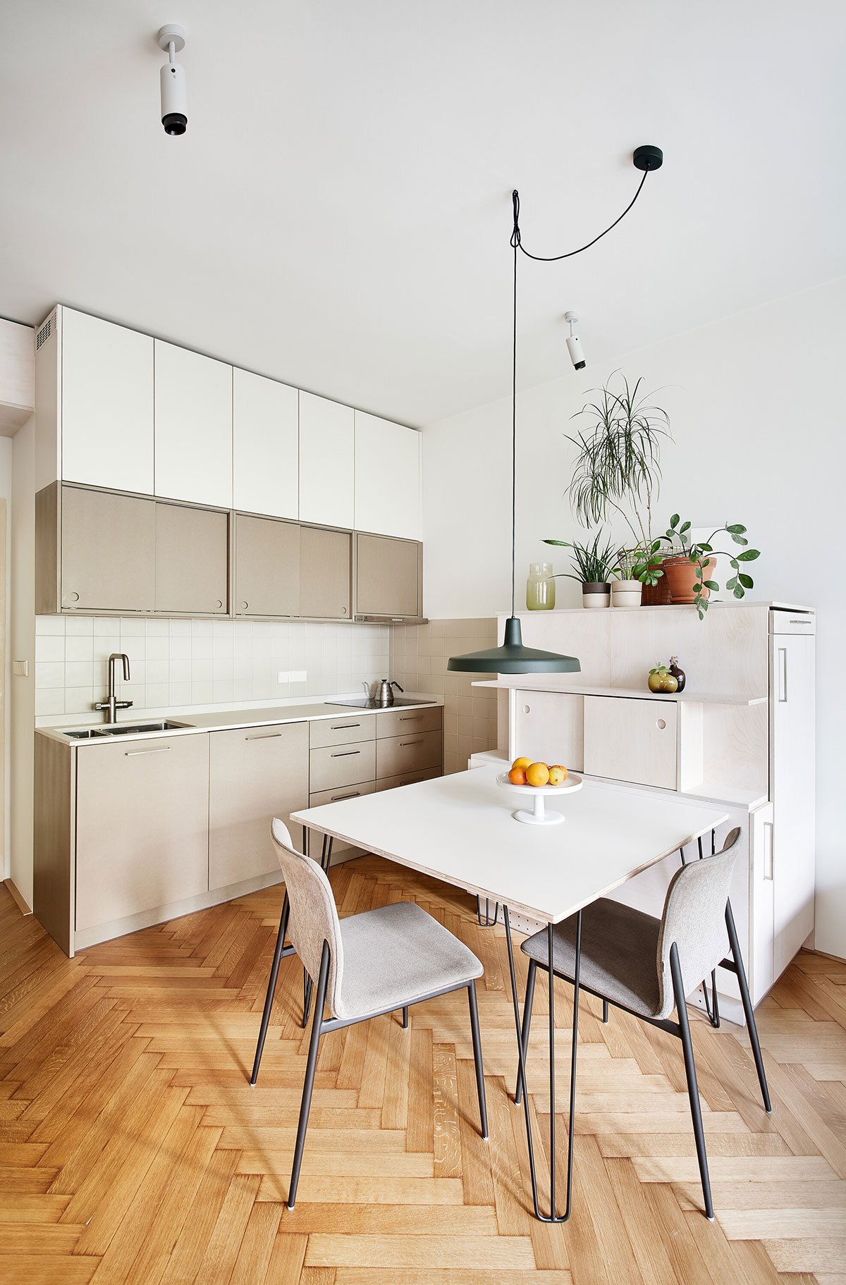 Excerpt: Baranova Apartment by Markéta Bromová architekti features the refurbishment of an existing compact home into a functional two-bedroom space. A central bookshelf divides the bedrooms while maintaining openness, and a multifunctional living area combines the kitchen, dining, and lounge. The design prioritizes efficiency, comfort, and natural light, creating a harmonious and practical home for a family of three.