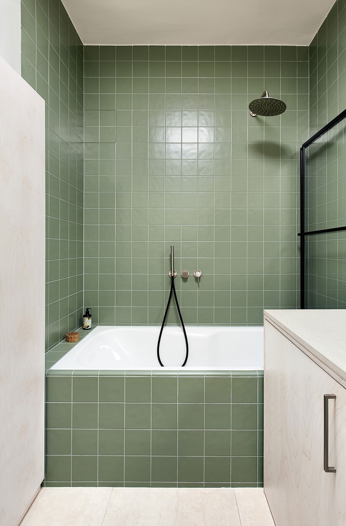 Flooring: The original parquet flooring in the main living area was restored and continues seamlessly into both bedrooms. This unified surface creates a harmonious appearance throughout the apartment. In the hallway and bathroom, the original tiles were preserved, complementing the new interior elements with their color tones.