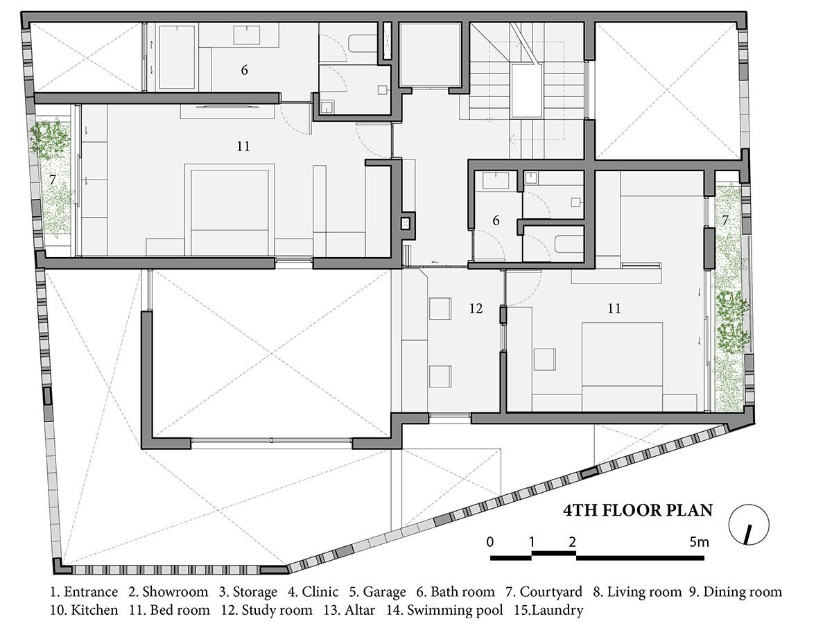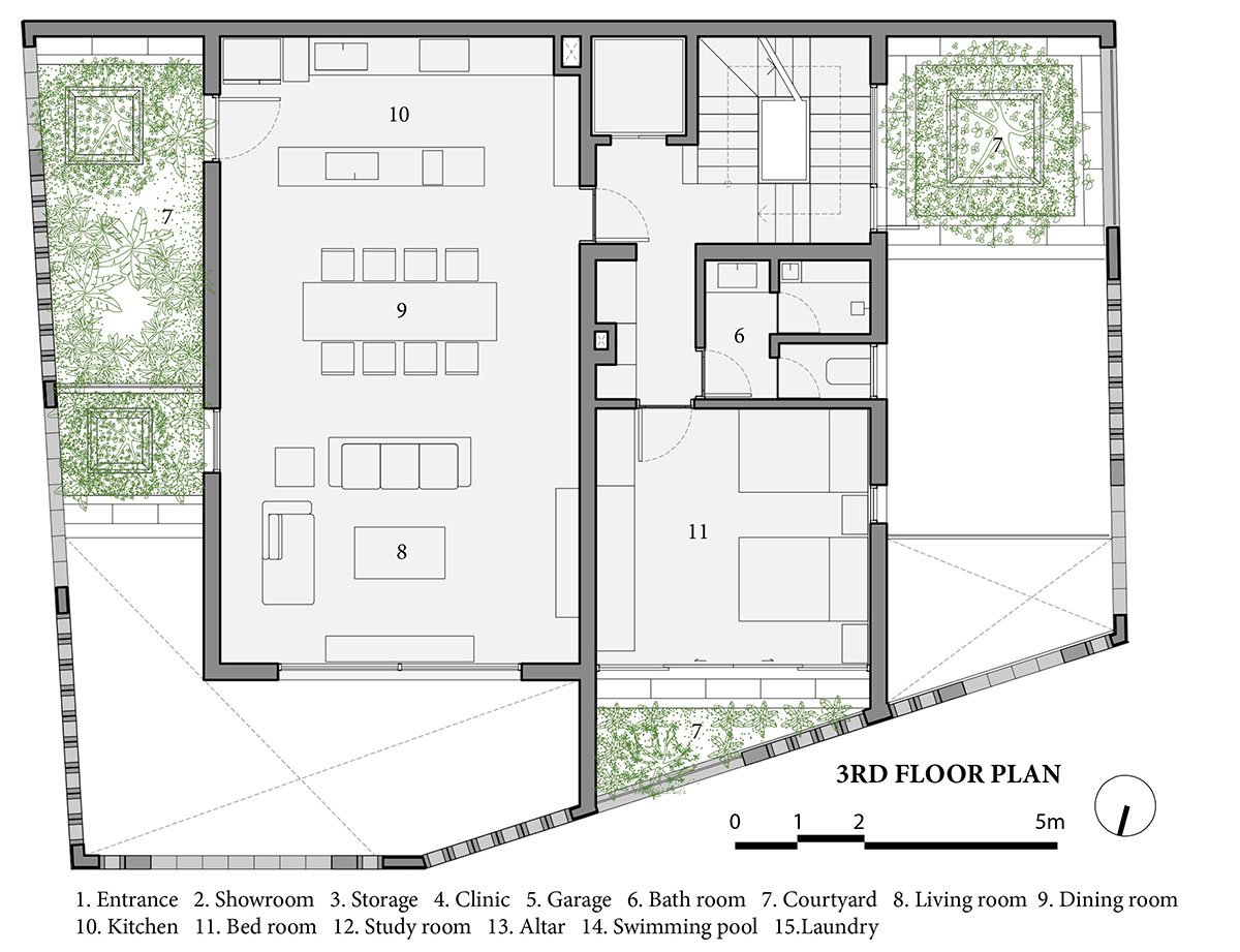 The uses of artificial air conditioning were unnecessary as the three-layer ventilation system “exterior ceramic façade”, “alternating green spaces” and “door” guarantee that the house is “absolutely cool”. Solar panels and rainwater collectors also took part in the sustainable design. Vast windows and alternating ceramic openings connected by the indoor forest create a multi-layer living picture frame that would be ever-changing for the occupants.