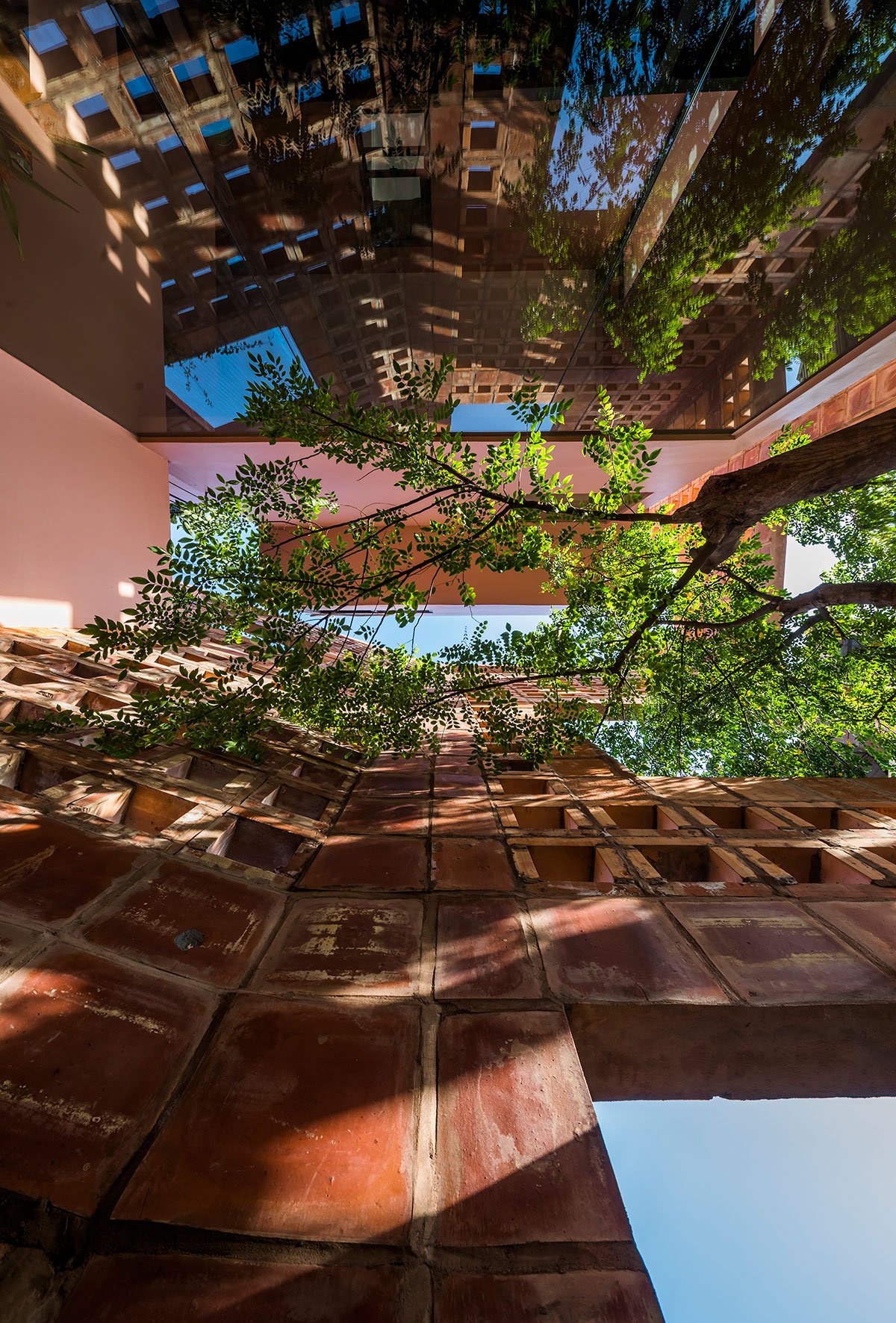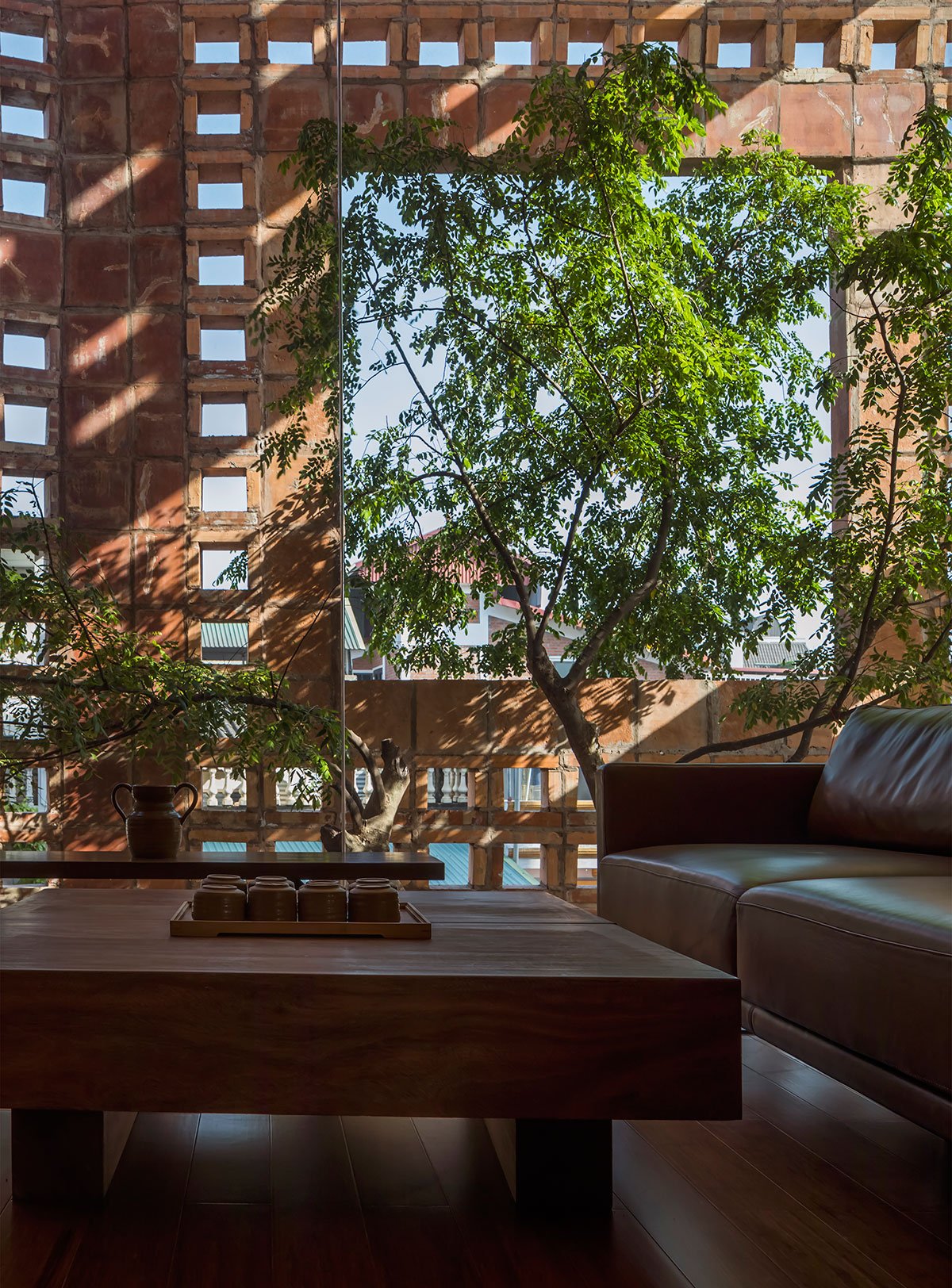 In the cultural-rich context of the village, using local materials was prioritized by the design team. Additionally, the owner was a ceramic specialist, hence VTN Architects were able to take advantage of the material. Ceramics has its own rough aesthetic and high durability, which was suitable for the exterior skin of the building. The entire façade of the design was made purely out of ceramic bricks. The bricks were individually made to size to create the alternating rhythm, opening up in some spaces while closing in others. The small gaps created by the brick’s placement act as vents, circulating the air throughout the building. Whereas the big openings of the façade situated sizable greeneries, allowing filtered light the flow through.