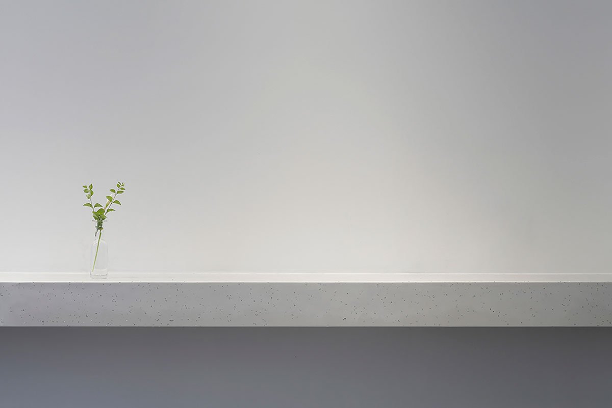 The dried flowers and sundries are displayed on the light gray stone counter which has 5meter length. This counter is so strong that it can be used as a reading bench. At the top of it is a shelf for books and small items.The shelf has a minimal design so that only unnecessary panels can be seen from the front so that it can be used from the both sides.The kitchen with the same stone top plate as the counter is a special order item and is arranged to connect with the washing machine and the refrigerator. This space is in perfect harmony with the old furniture owned by her.