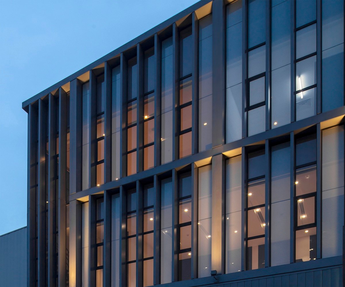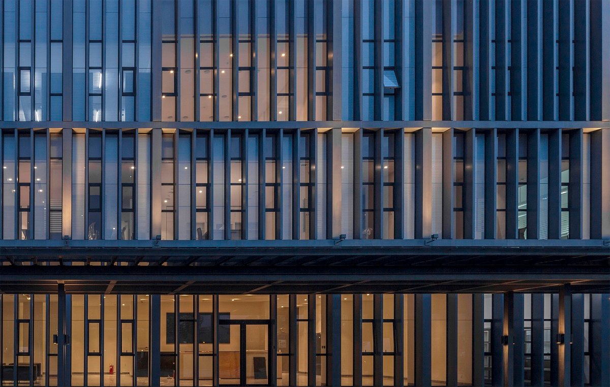 While resolving the three-story mixed program of offices, meeting rooms and research labs, the need for identity and natural daylight was equally to be addressed. To this end, Gibert referenced Japanese informed latticework thus creating a blurred boundary between inside and outside while breaking down the building’s frontage into a set of vertical fins – different in size and intermittently spaced by slender panels of ceramic fritted low-E glass – and doing so producing a rhythmic play barely perceptible at first glance. Expands Gibert, “Our client has an international network and the building’s aesthetic must communicate that to their collaborators. For that purpose the lattice clad was an intentional representation for Asia, in that sense through the expression of a post-and-lintel frame narrative, while the abstraction of such a device simultaneously connotes a global perspective”.