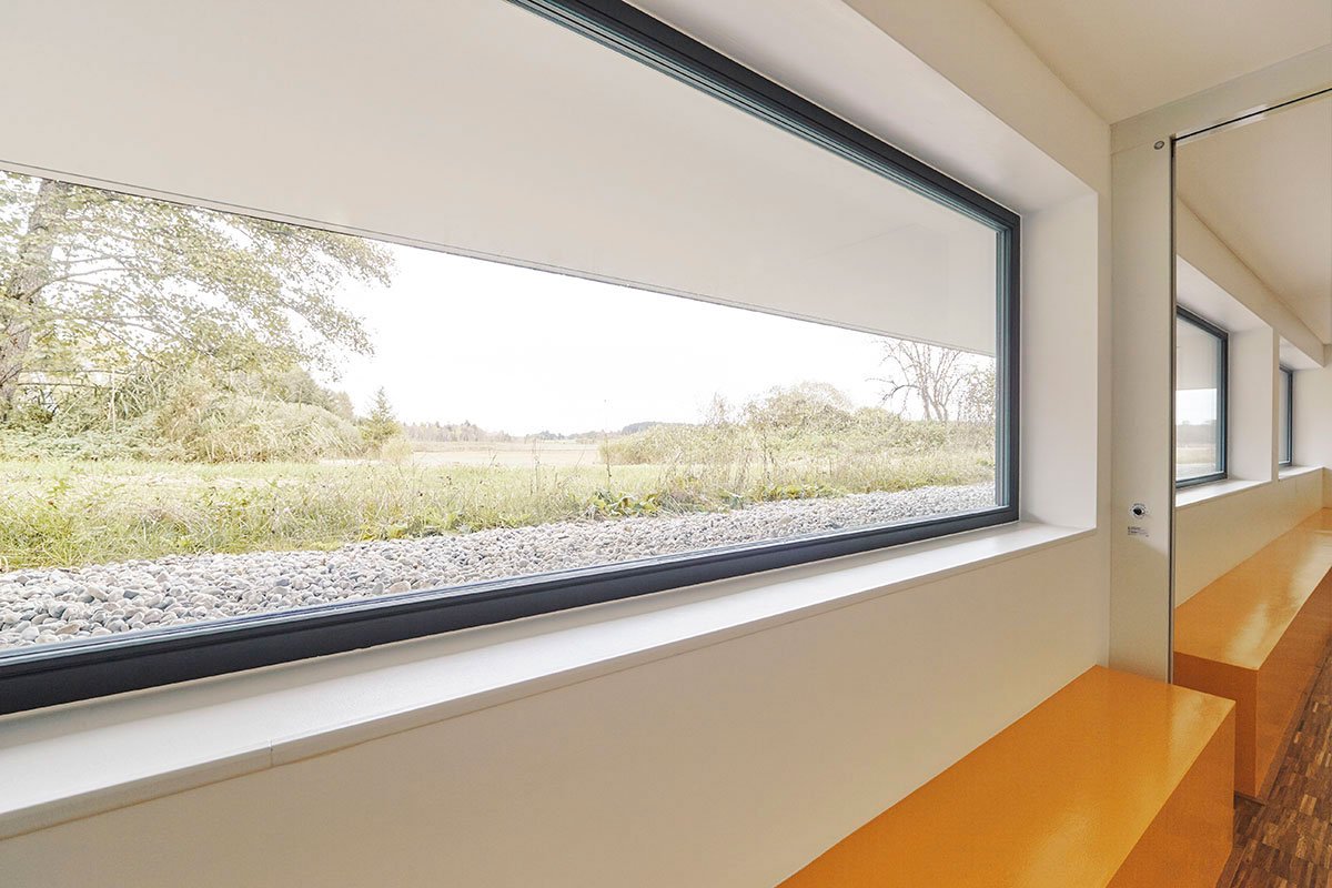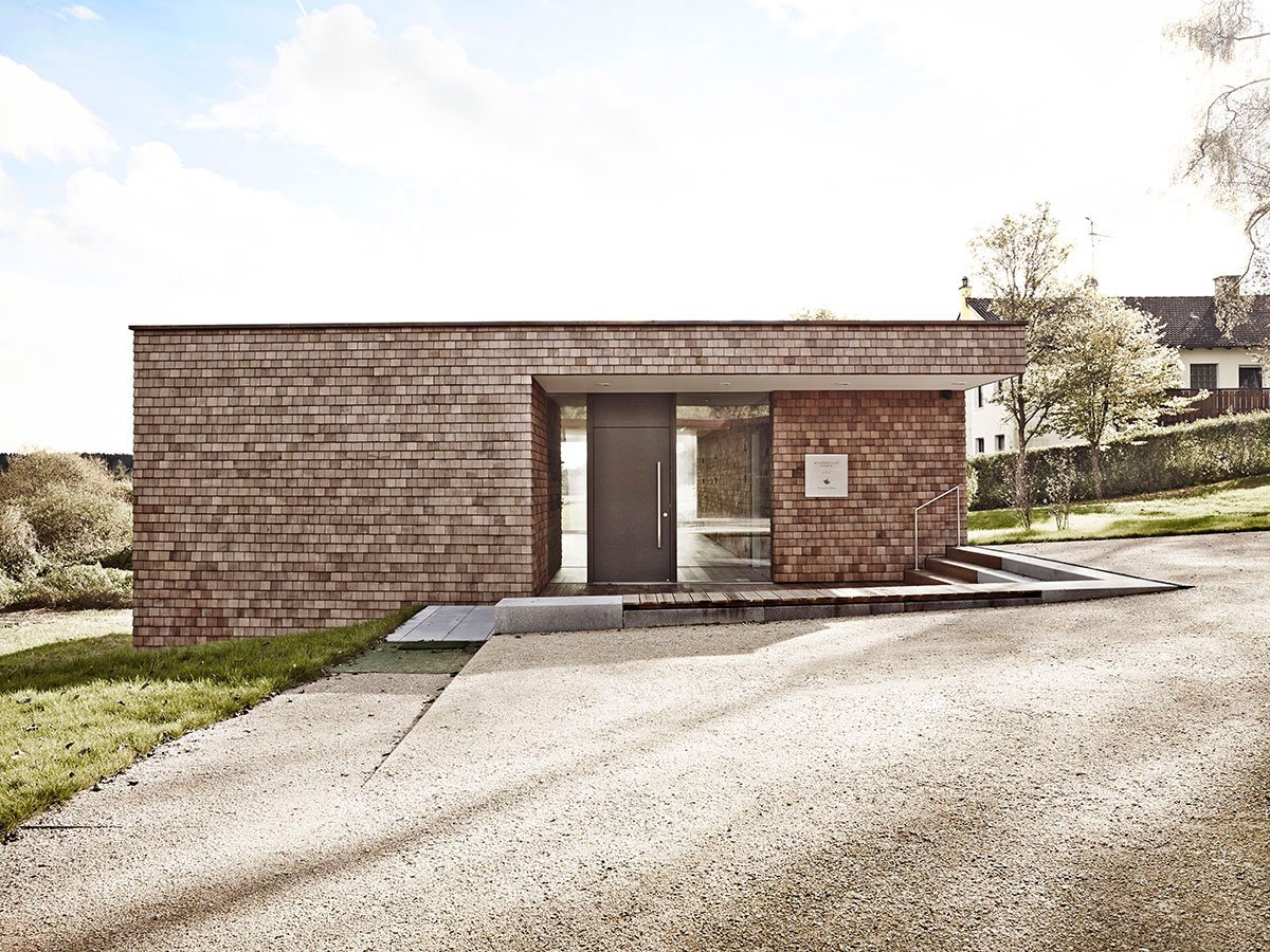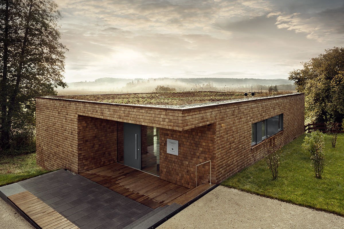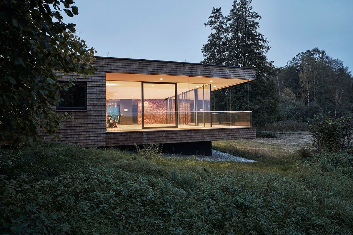 Two of five proposed variants were detailed as photorealistic visualizations, of which the variant of the wooden shingle cube with a huge panoramic window was now executed. The new building consists essentially of a large community room with a sensational view of the nature reserve.