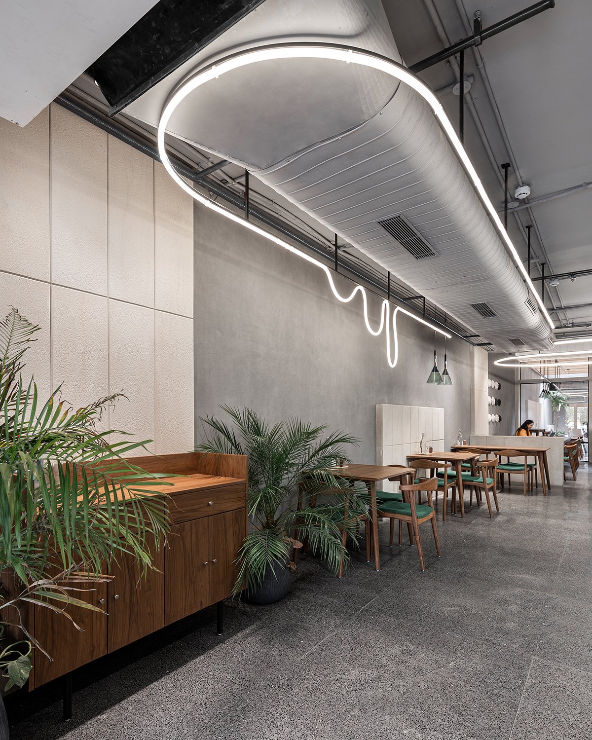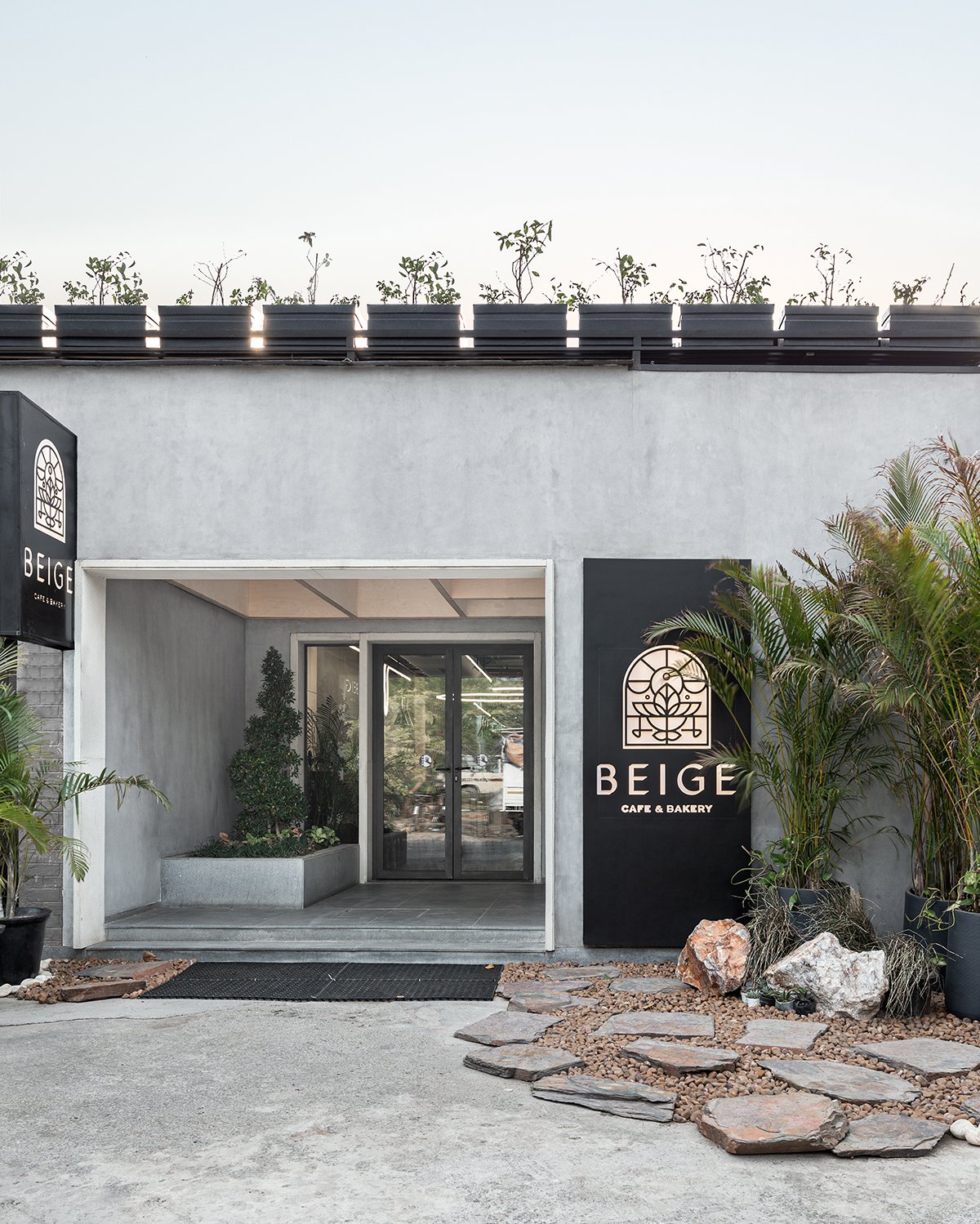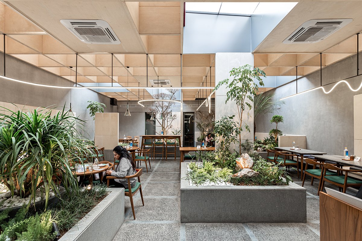 Excerpt: BEIGE Café & Bakery, an interior design project by Arch.lab, serves as a seamless canvas of calm, nature, and modern minimalism. The space unites open-to-sky and structural zones into a single volume envisioned as a jungle, where nature thrives at the core. Wooden coffers, planter beds, and diffused light create warmth and intimacy, while concrete, stone, terrazzo, and light wood maintain continuity.