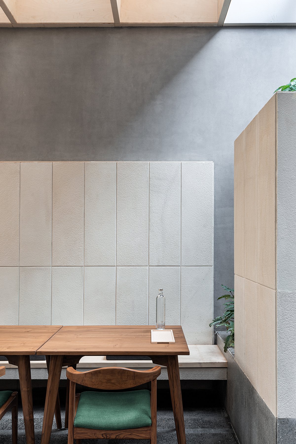 A deliberate attempt has been made to achieve a visual continuity between the two zones into a single volume. This single volume was envisioned to be like a jungle, where you are going to nature, rather than a tamed version coming to you. The daylit rear portion is the core of the design. It meant nature could thrive here. A wooden coffer ceiling helps break the volume to a humble height, and acts as brise –soleil to break the sun’s harsh light and lend a warm hue to the space. This diffused light lands on the strategically placed large planter beds that create sitting zones. A glass wall connects the interior with the ‘outer’ daylit zone.