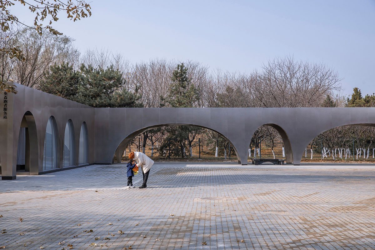 Excerpt: Beijing Olympic Forest Park’s Runner’s Station, designed by TEMP, is built inside Beijing’s Olympic Forest Park as a public utility. With both sides opened, the arcade welcomes traffic from all sides and merges with the plaza. Several parabolic arches form an arcade that shelter lines of lockers. Raised by flat and steep curves, the arcade yields a powerful symmetrical presence in the open air. The facility not only serves the public functionally but also highlights aesthetic values of design.