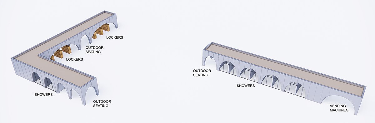 With both sides opened, the arcade welcomes traffic from all sides and merges with the plaza. Several parabolic arches form an arcade that shelter lines of lockers. Raised by flat and steep curves, the arcade yields a powerful symmetrical presence in the open air.