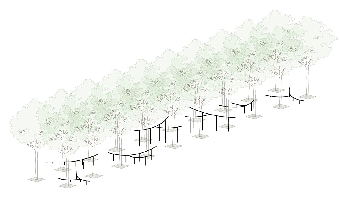 During onsite studies, the team observed runners stretching with whatever natural props nearby — stones, trunks or branches. To address this need, the architect proposed to install multiple stretch bars that curved to various directions, to fit all body types. The slender white curves of the bars serve dutifully among the trees, blending into the curvy branch lines and white trunk paints.