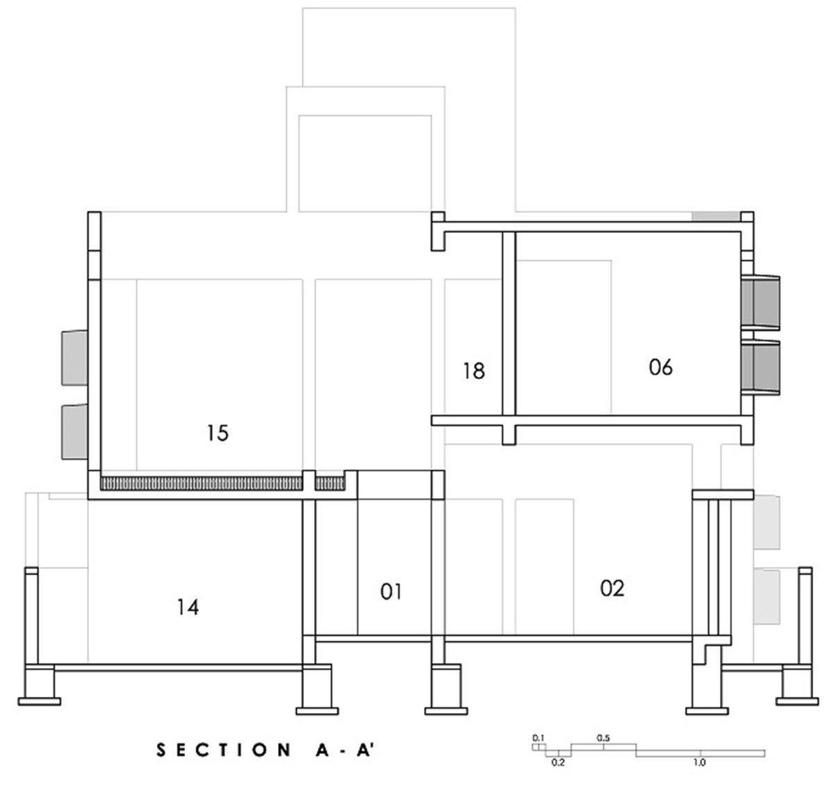 The upstairs houses two bedrooms in a row, with a long passage terminating towards the north in the Reading Space, which overlooks the Terrace Garden.