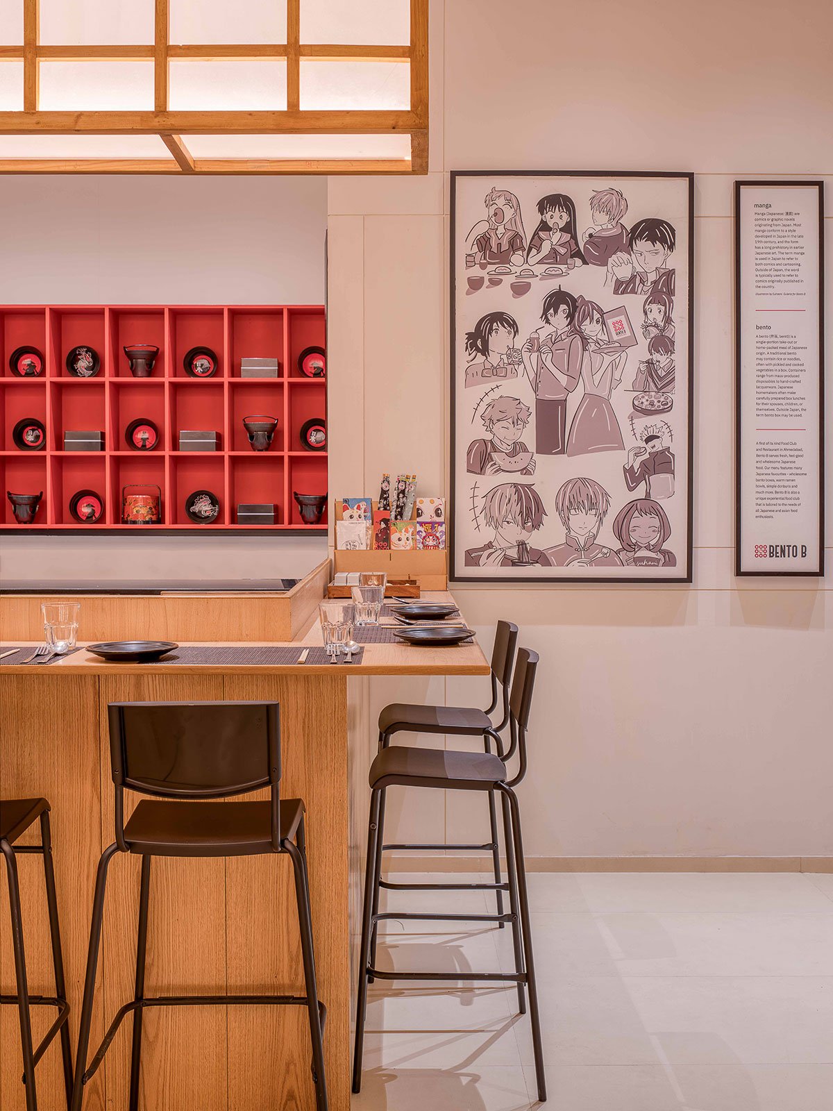 [Text as submitted by architect] Bento B has gracefully asserted itself as a beloved and sought-after Japanese culinary haven in Ahmedabad for the past two years. Nestled in the corner of a premium retail and commercial building, overlooking a serene courtyard, the restaurant found itself presented with a unique opportunity for enhancement when its neighbour, a larger restaurant closed its doors in October 2023. This shift marked not only a transition but also an exercise in adaptive reuse, requiring a delicate balance between embracing the existing spatial constraints and introducing novel design elements.
