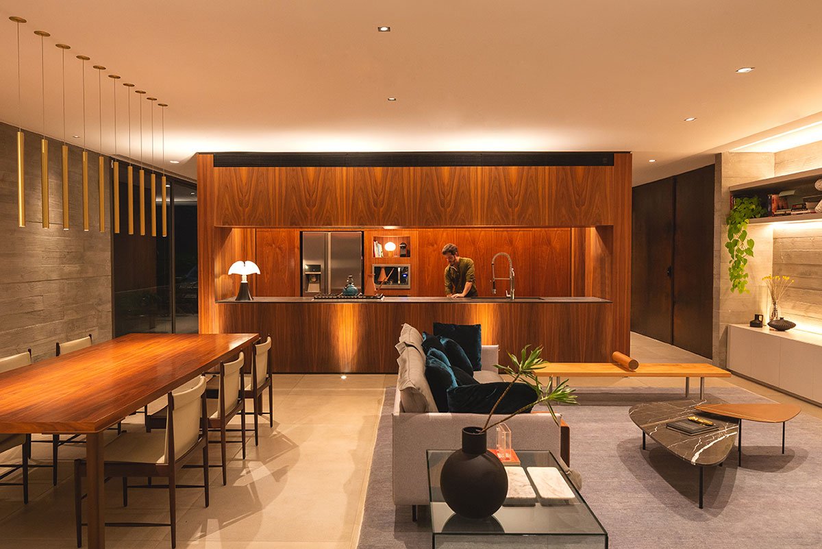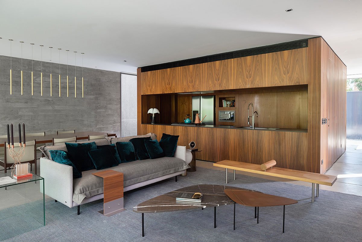 The ground floor, in the opposite way, opens up to the garden in a fluid way. The notion of inside and outside is weakened by the large glass openings, while the furniture establishes a harmonious dialogue between architecture and the Brazilian design of the pieces. We designed some of them, such as the Brasilia coffee table, the Ensemble dining table, the Box side table, and the Move bench.