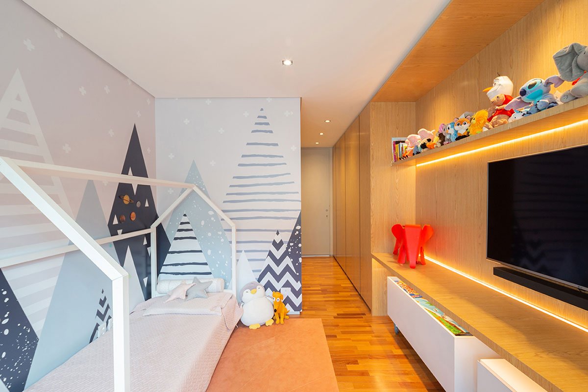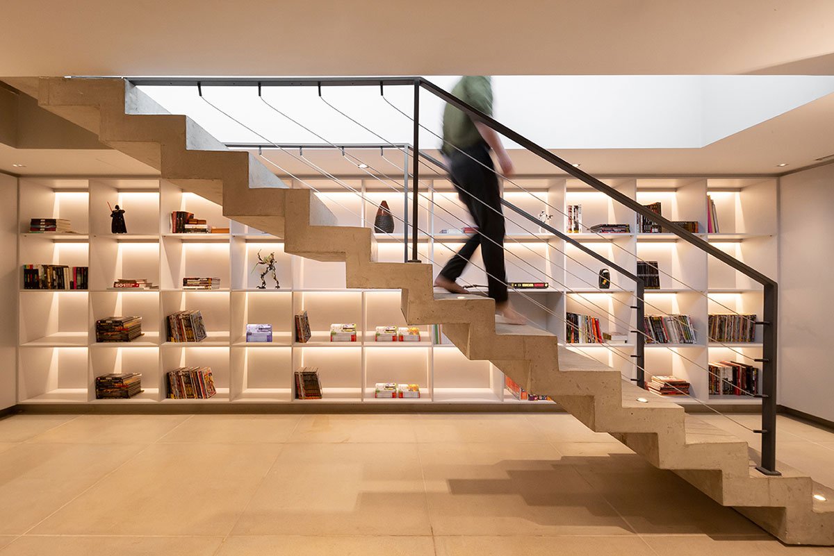 The lower floor supports the ground floor and is in the basement so as not to block the view of the perimeter gardens. The project is a contemporary urban residence for a young couple with two young daughters. So, functionality is essential.