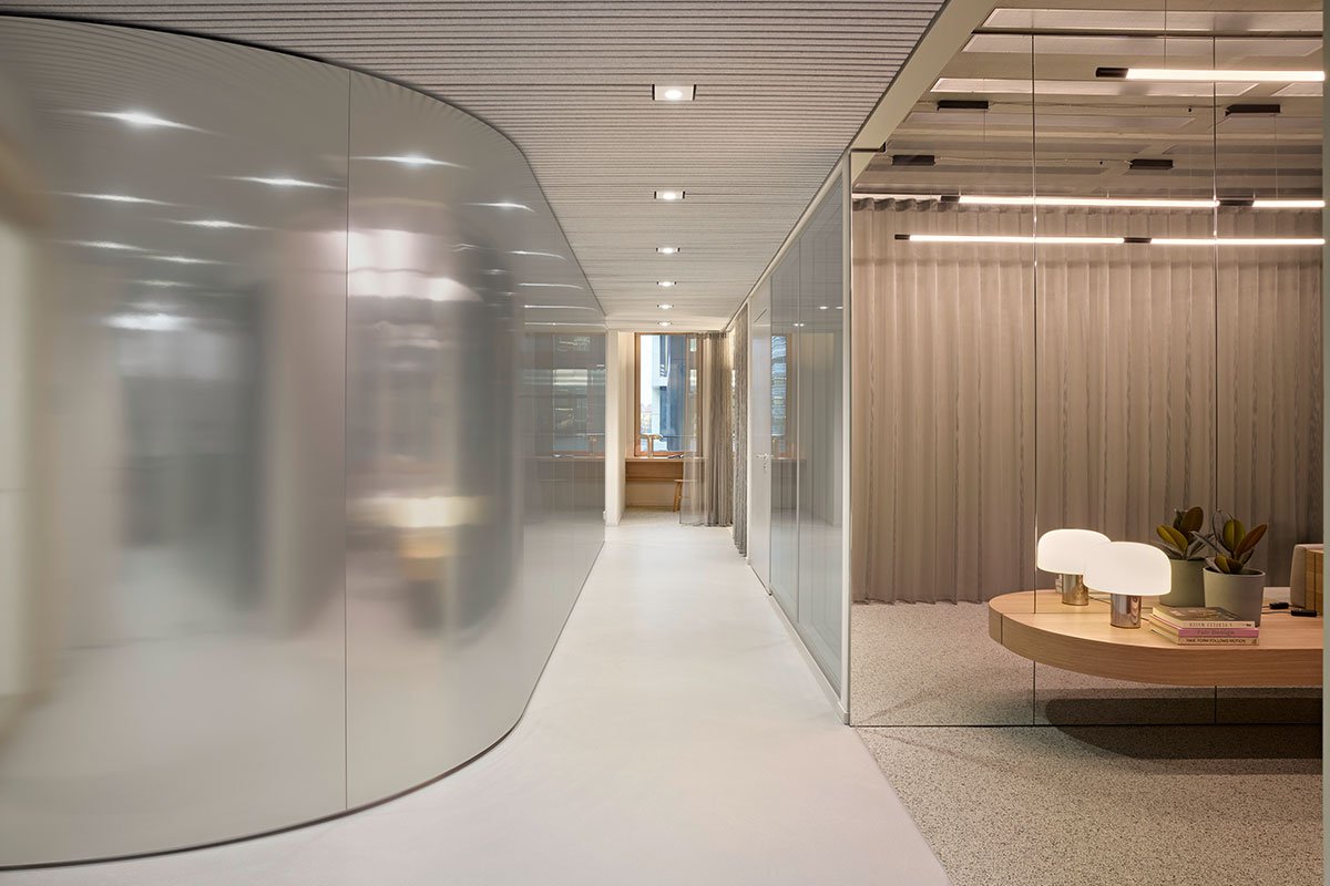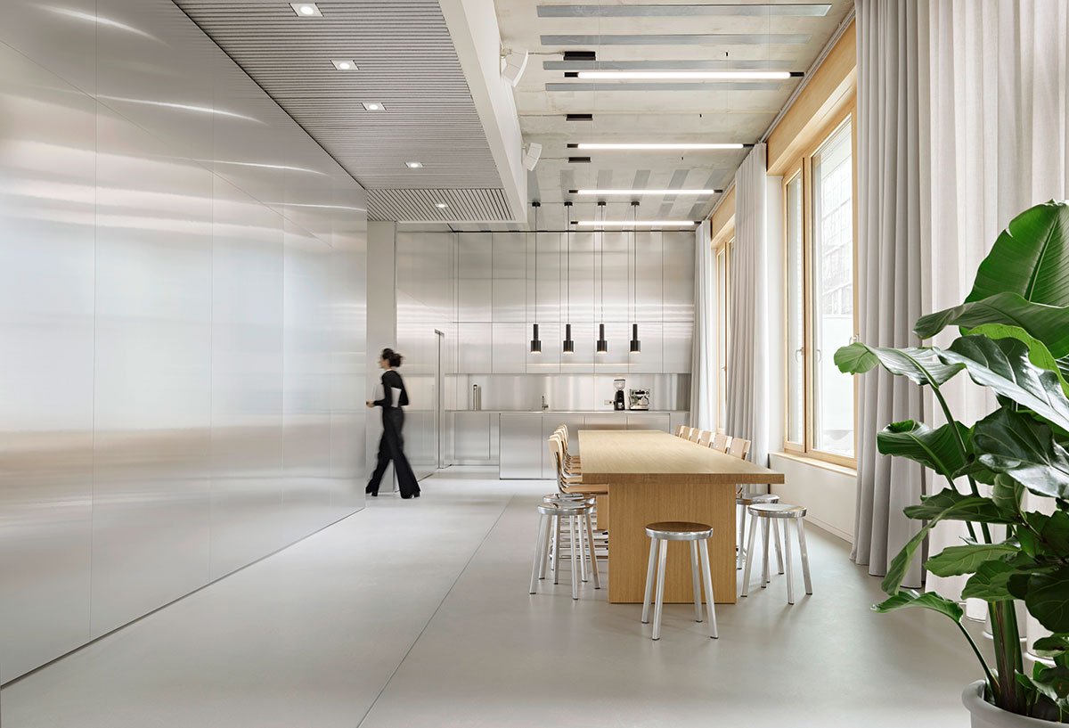 Reduced and timeless in nature, the BESTSECRET brand aesthetic sets the stage for featuring upscale fashion brands in the digital space. The interior design conceived for the new headquarters toys with this idea to transform it into a tangible space using carefully selected colors, materials, and objects. A warm gray shade on the walls works in concert with exposed concrete ceilings and light gray seamless floors to create a neutral backdrop that makes the buil-ding the physical equivalent of the digital brand identity. Reflective and mirrored surfaces expand the space visually, while generously applied textile materials establish a reference to the world of fashion.
