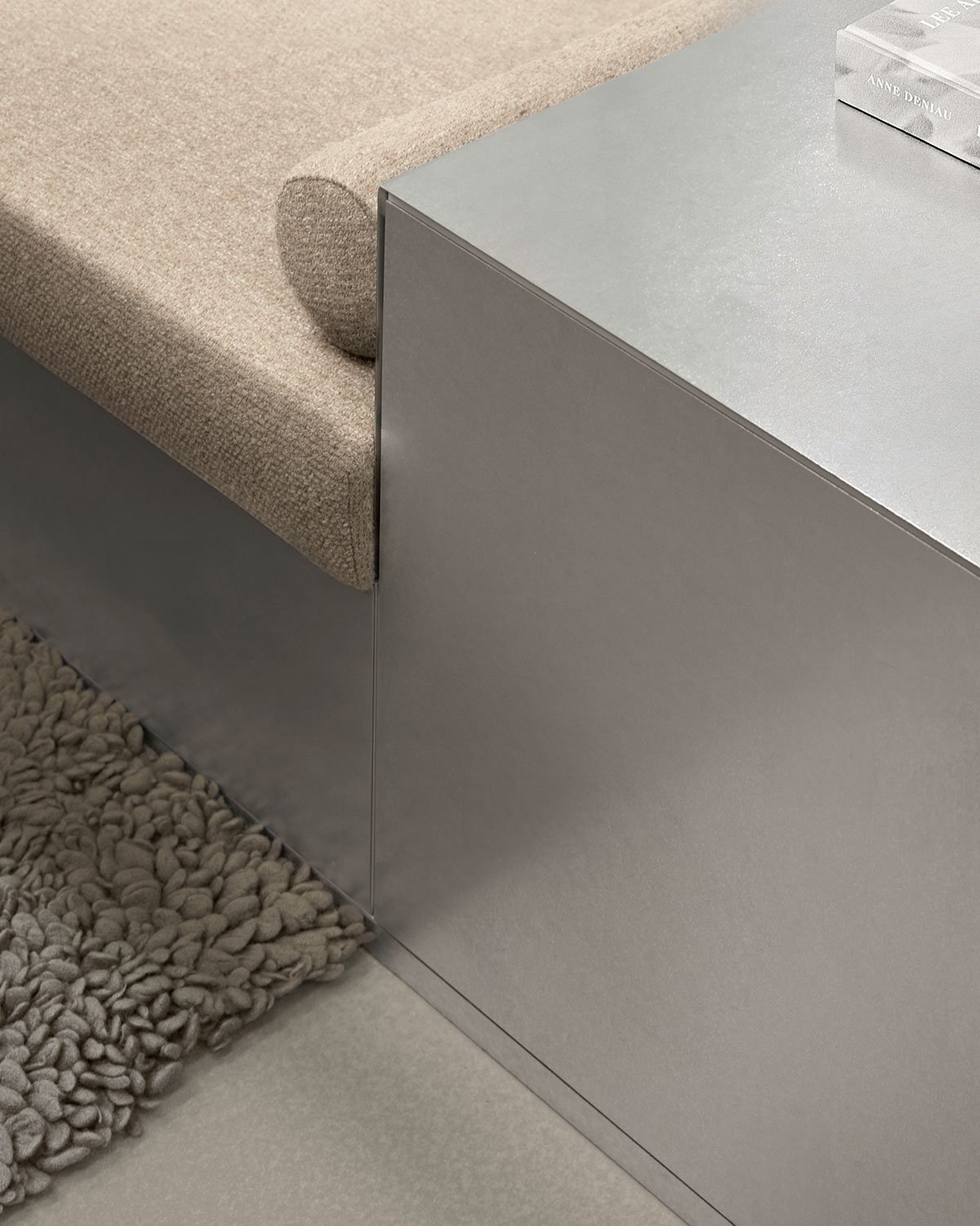 Contrasting textures and shapes – cool mirror surfaces versus warm wood, sturdy metal versus gentle, flexible textiles – lend a clear and coherent appearance to the interior space. The industrial appeal of raw surfaces such as architectural concrete and galvanized metal intriguingly contrasts with homely, custom-made wooden furniture that extends along the outer walls to incorporate small benches and shelves.