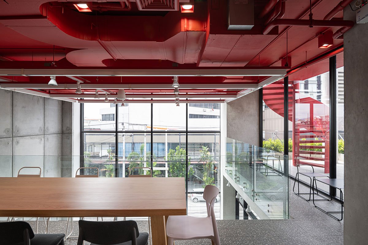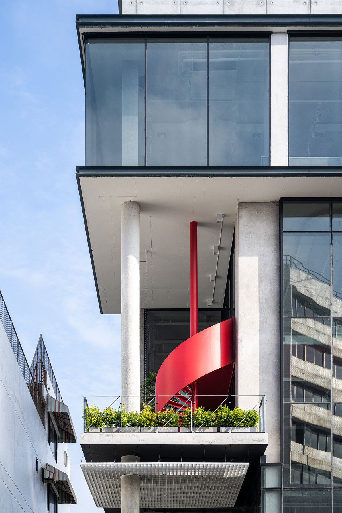 At the same time communicate with simple shapes, in order to maintain the facade of the surrounding context, the new building quietly fills the emptiness but can still be detected. The front of the building opens up a narrow entrance to make it airier by showing double volume and round columns that support the front through to the 2nd floor additionally. Moreover, the 3rd area is also designed to open mass to show double volume repeatedly by adding a bright red spiral staircase connecting the interior space with an airy corridor that can see the continuity to the 4th floor.