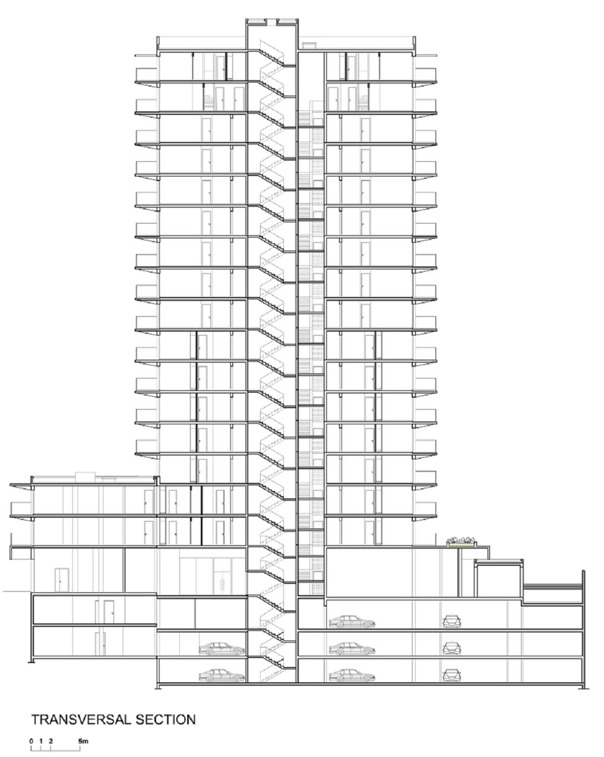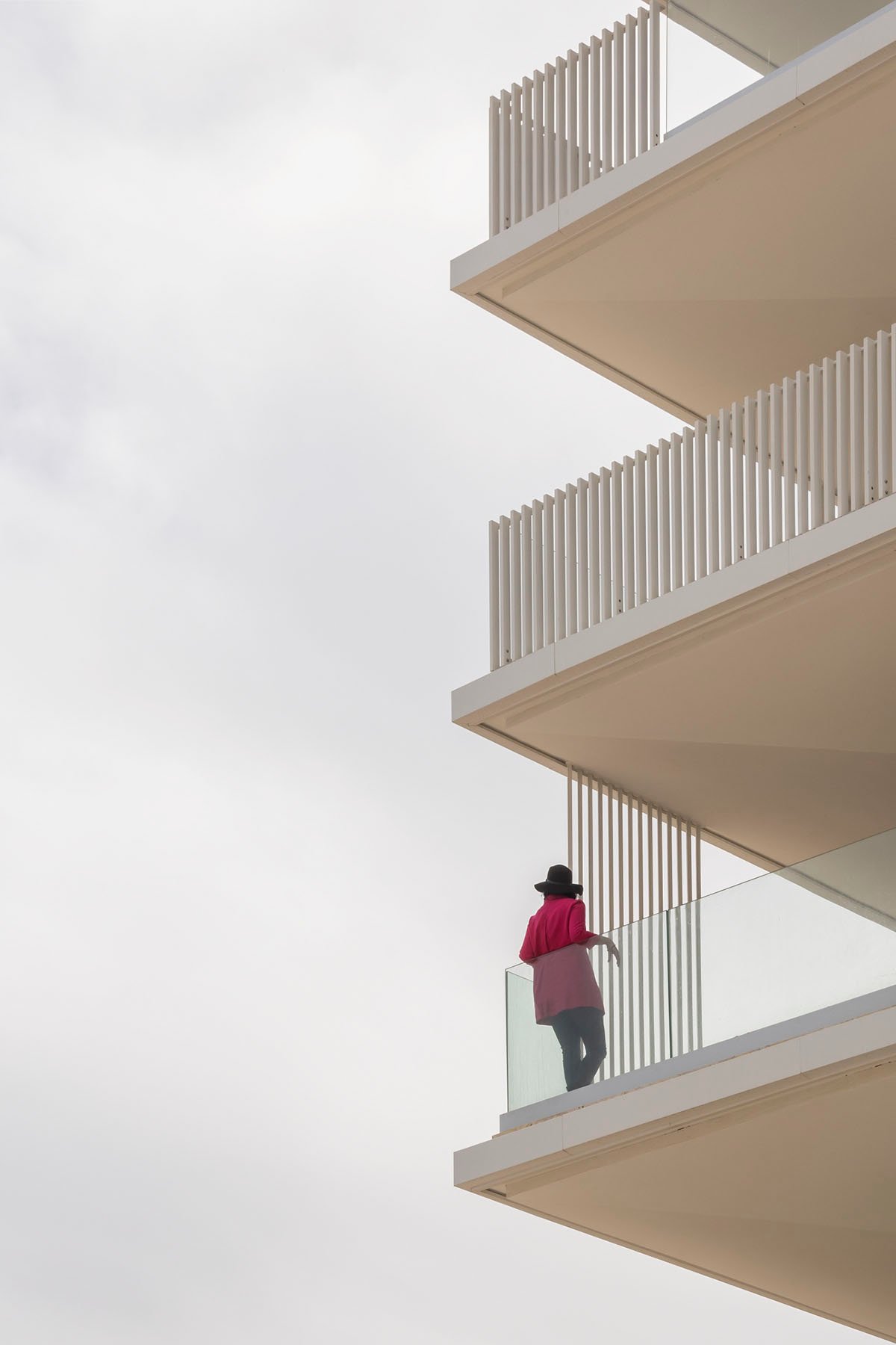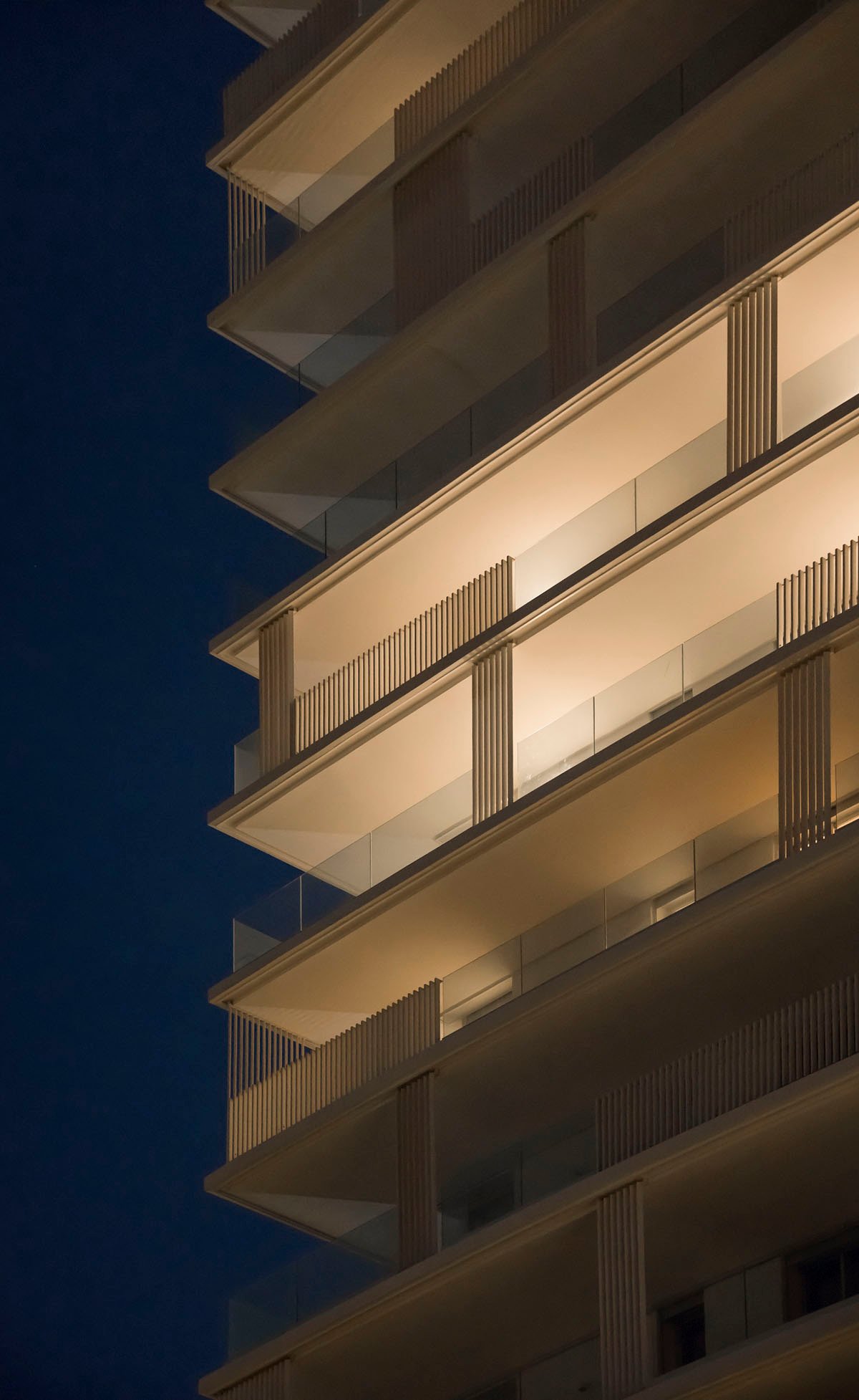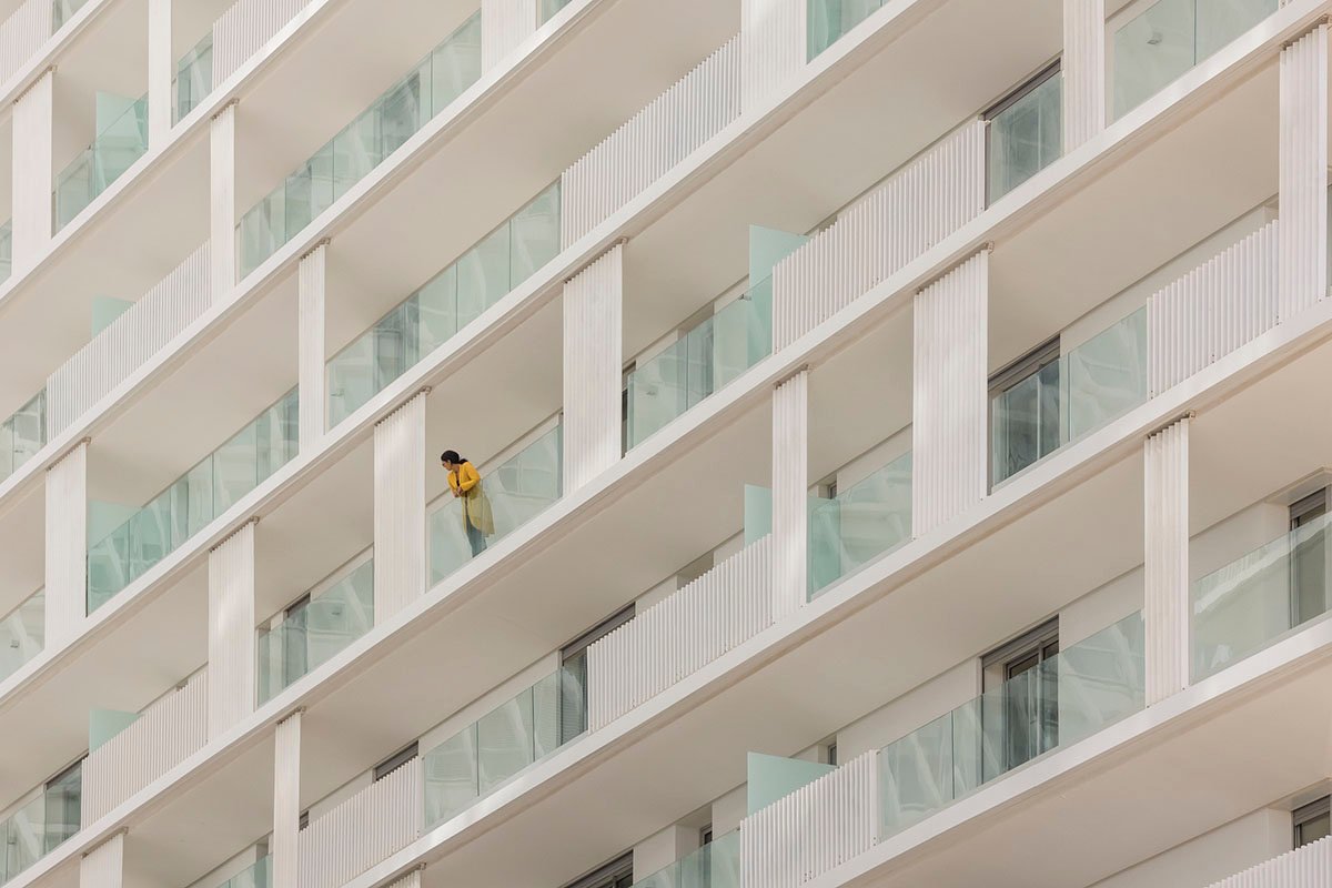 These terraces are not projected onto the void, but benefit from vertical screens, relatively concentrated at the level of the bedrooms and widely spaced at the level of the reception areas. These « claustras » make it possible to occasionally offer areas protected from sunshine, looks, and the wind while leaving a semi-transparency. They also make it possible to draw a protective “line” which outlines the periphery line of the various apartments and reinforces the feeling of interiority. This skin, white in color, will play with the effects of natural light to adapt to the ambient light, thus creating a vibrant facade depending on the time of day. The interplay of the balcony railings, in glass or white vertical carpentry, creates a specific pattern, a sort of modern “calligraphy” which gives the project its graphic expression.