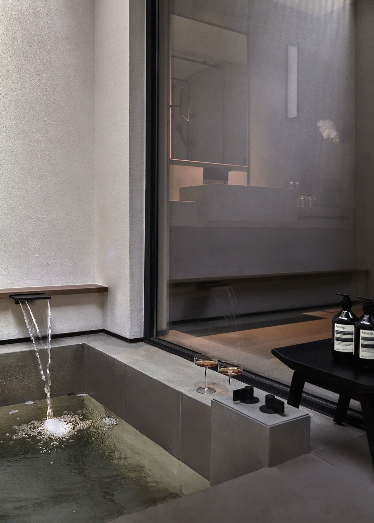 A sunken pool open to the sky’s light, a cup of thin wine, at ease. From the courtyard to the bedroom to the collection, the space progresses from outside to inside and from inside to out.