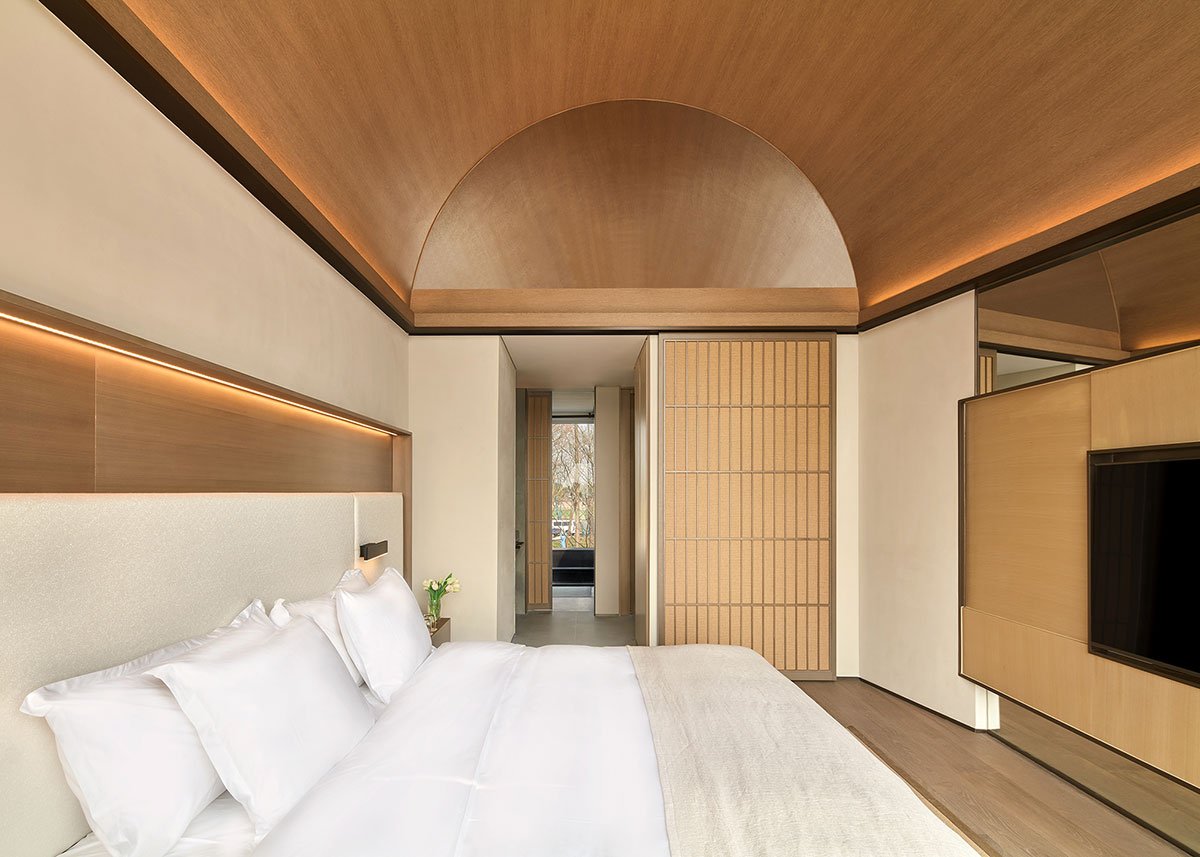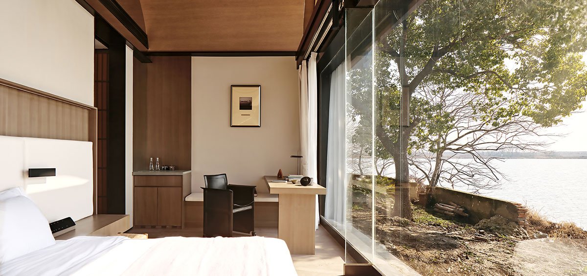 The guest rooms on the second floor retain their high vaulted ceilings, buffered by a foyer, and then have a horizontal opening to the room layout. The tall and wide floor-to-ceiling windows are enough to incorporate the outdoor scenery into the interior. A seat in front of the window, a cup of tea, a pot of food, a vessel……a heart rests in peaceful living. Life is like a long boat, going for daily life and desire; love is the way back. At this moment, “the day on the boat” is to return to the essence of living and the deep meaning of the journey.