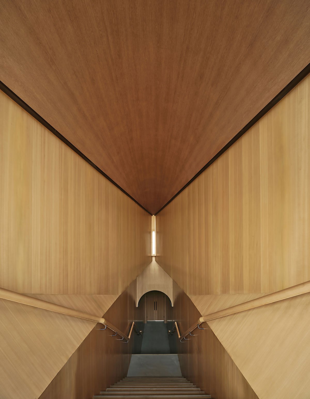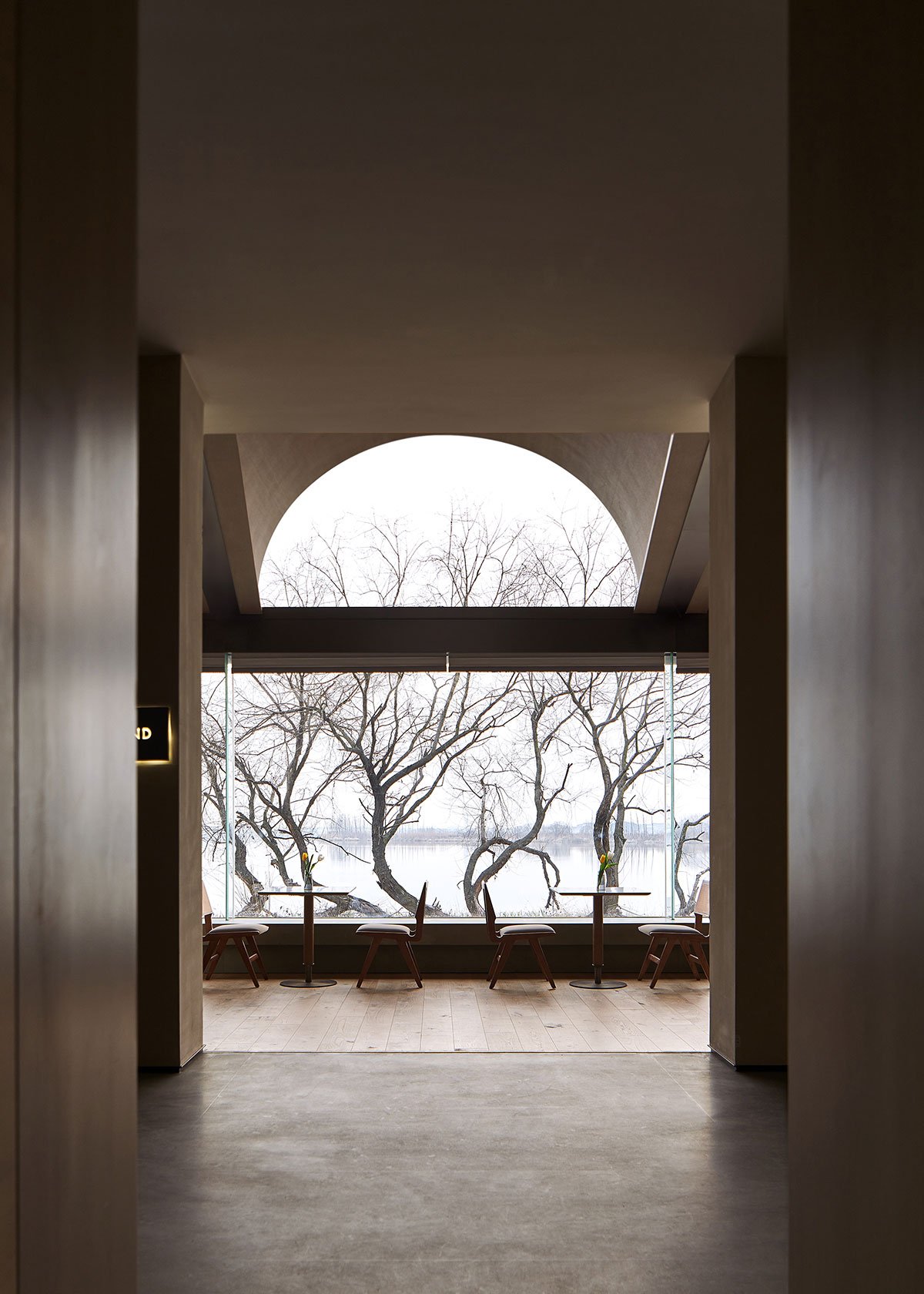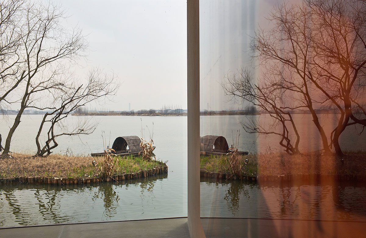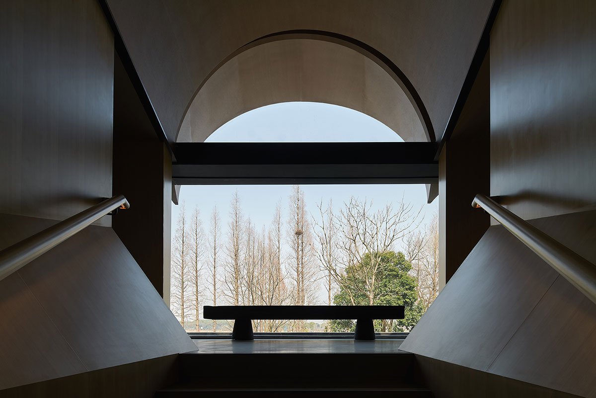 After passing the bridge, the large floor-to-ceiling windows open up the view. A bench with a carefully recessed water pattern invites visitors to sit and watch the water, trees and clouds on the other side of the isolated island.