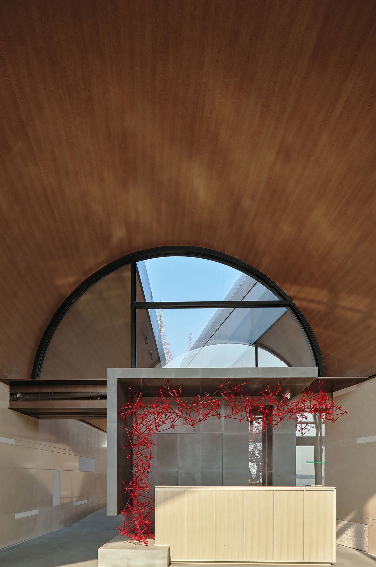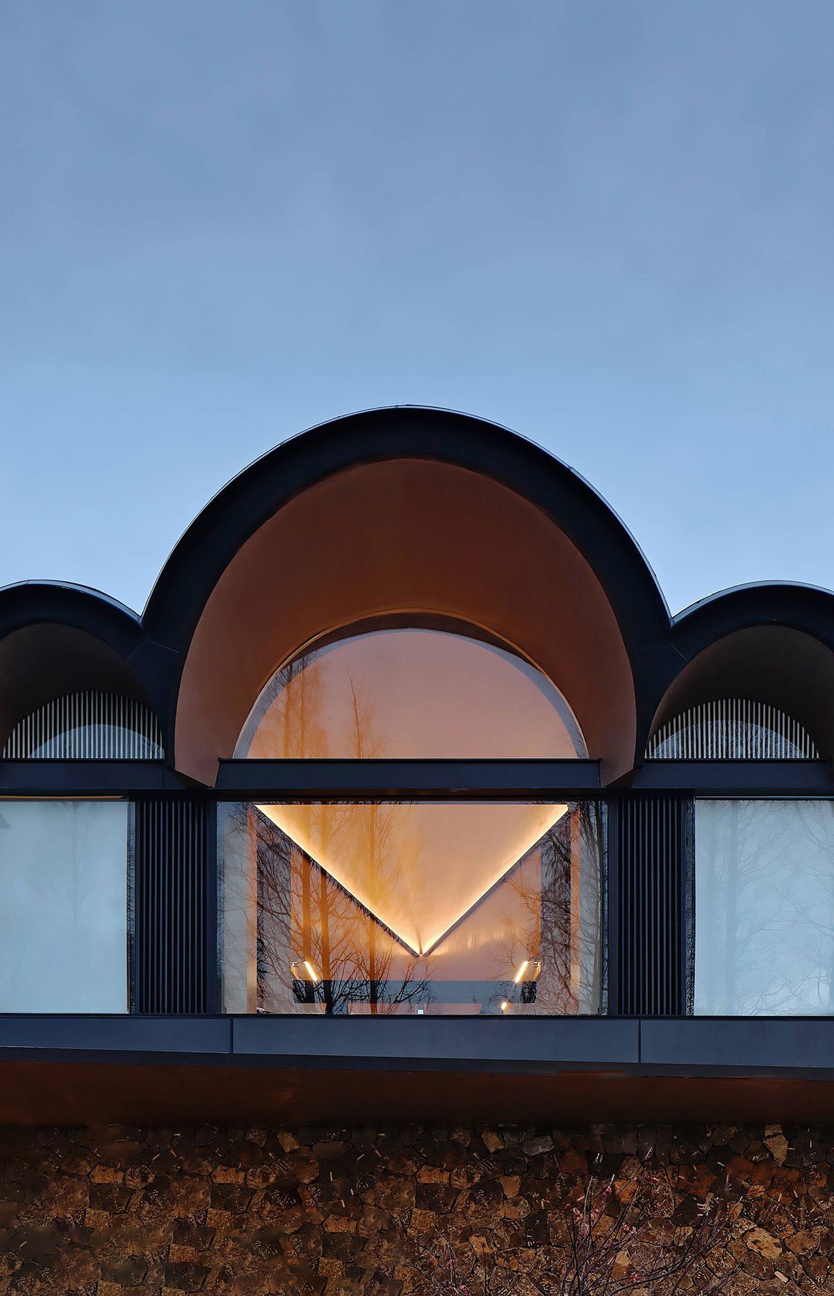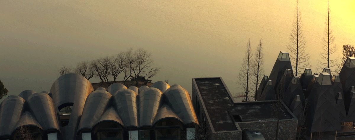 A floating island with a few dead trees stretches as if to welcome and detail the passage of time. The hotel building is integrated with the surrounding natural landscape. The high and low arched roofs form a colony, just like the ships docked on the waterfront of the rising mountains.