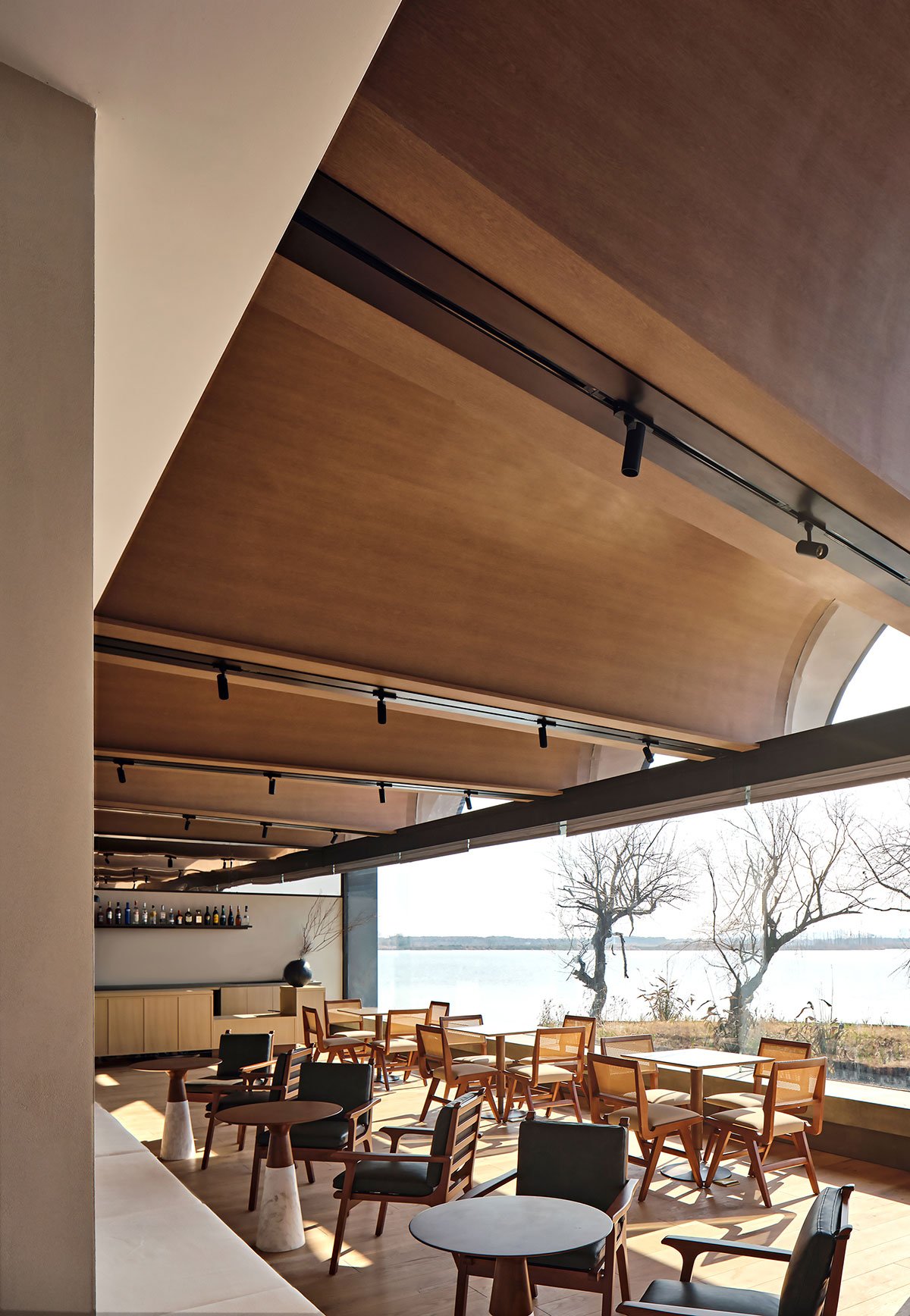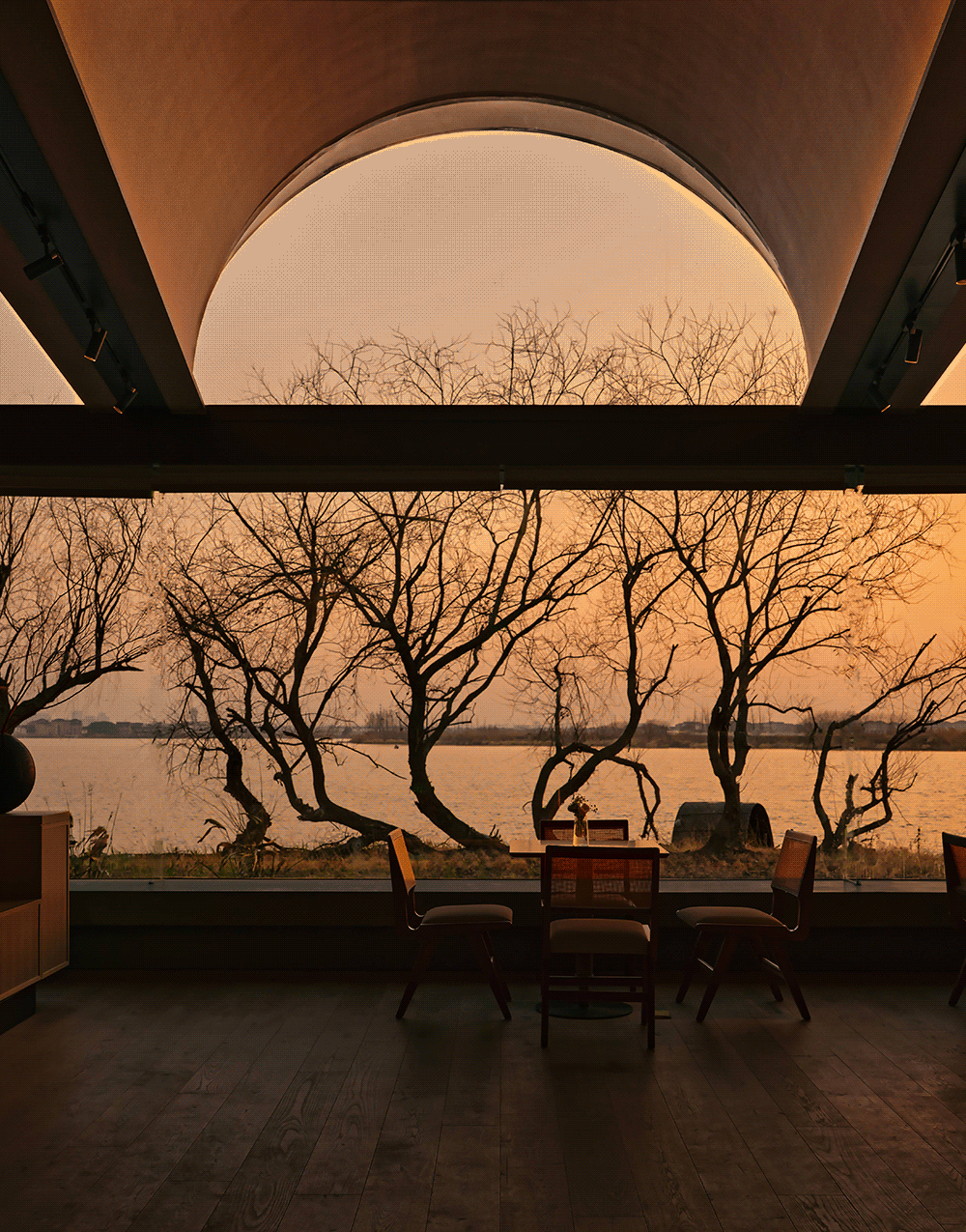 The room facing the riverbank offers a panoramic view of the waterfront. Leaning over the long case, people can enjoy the sunset with the shadow of trees and the light of waves. All this breaks the traditional spatial axis, not coherently, but in a leaping way, with pauses, turns, openings and subtleties, like a shallow singing, laying a gentle and charming scene.