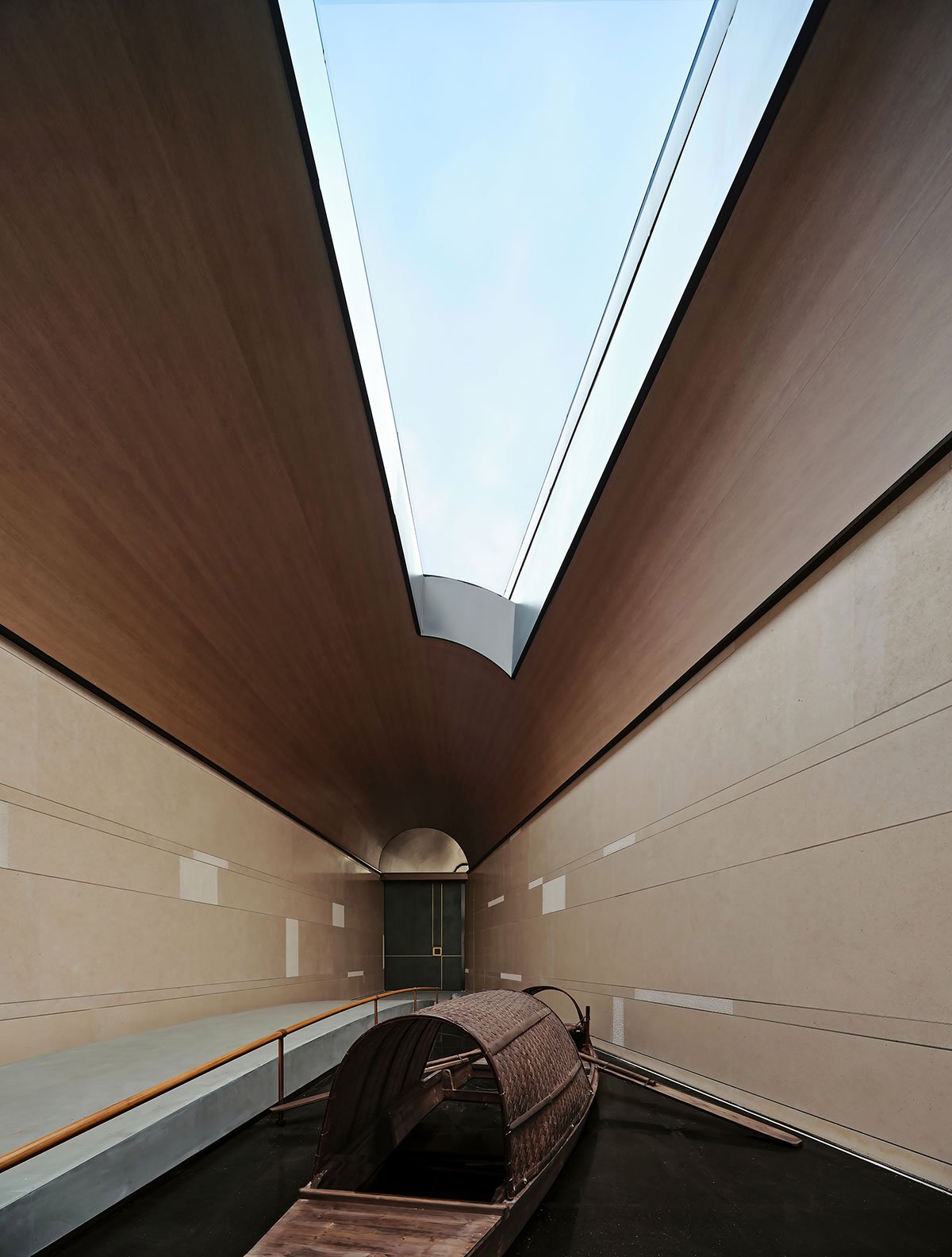 When you turn around and enter, a slightly arched trestle bridge and a crow-top boat are moored on the side. The light pours down from the dome’s skylight on a sunny day and is etched on the stone slab with time. If it rains, the water droplets keep falling on the canopy, and the scenic rocks and Jiangnan’s unique sound and colour are revealed in this area alone.