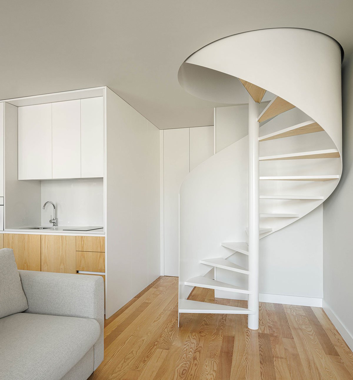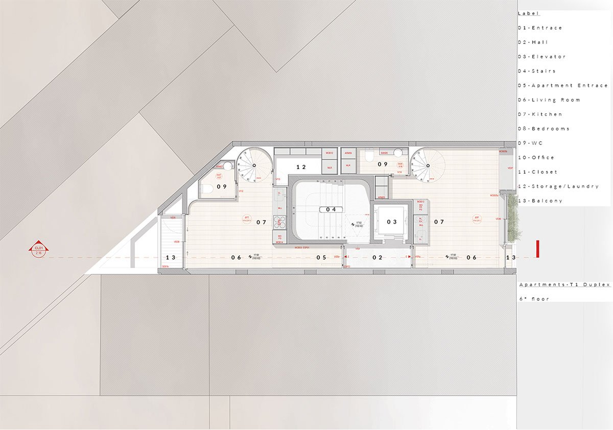 This way they managed to reduce the amount of area used for exterior corridors (non-saleable area) by optimizing the one from the apartments, which allowed the architects to integrate eleven units into the 649 m2 of available area, guaranteeing a wide variety of different typologies, each with its own characteristics, thus enhancing the value of the property. Despite the variability, and in order to ensure easy and correct execution of the work, they took care to standardize the elements that make them up.