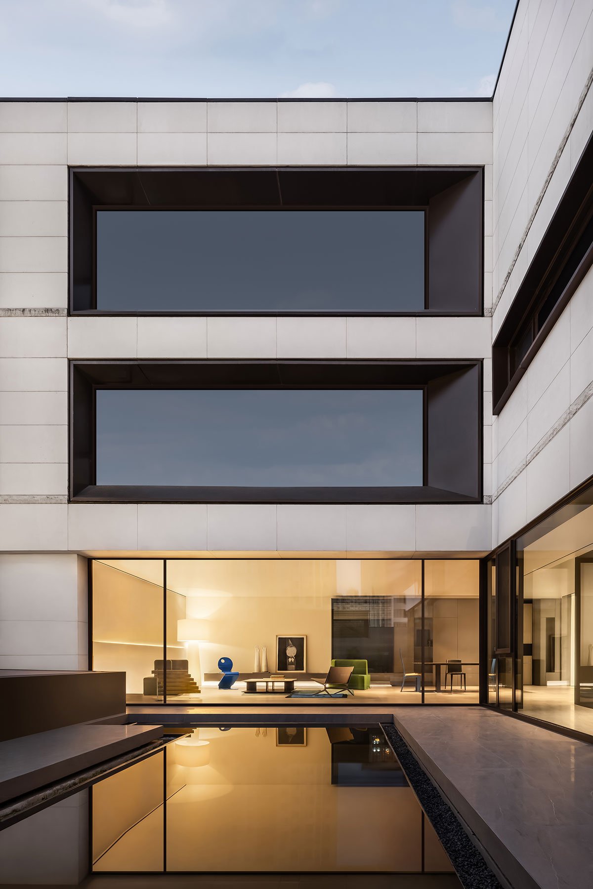 The five-story villa space is logically divided into two parts – the first to third floors are designated for the family’s living and dining requirements. Upon entering, the double-height foyer space and continuous L-shaped floor-to-ceiling glass windows offer an expansive visual experience, creating an infinite sense of extension.