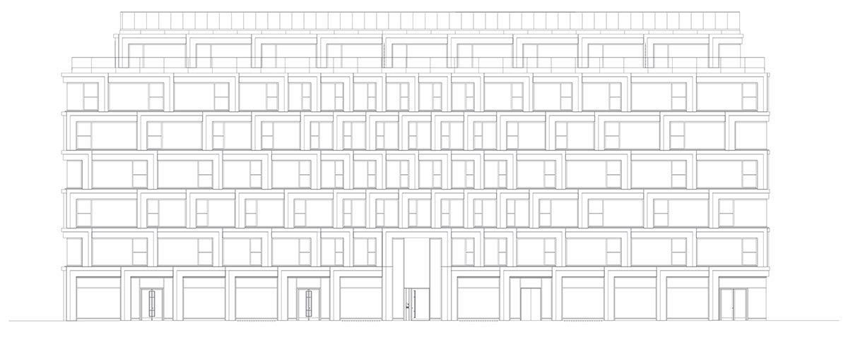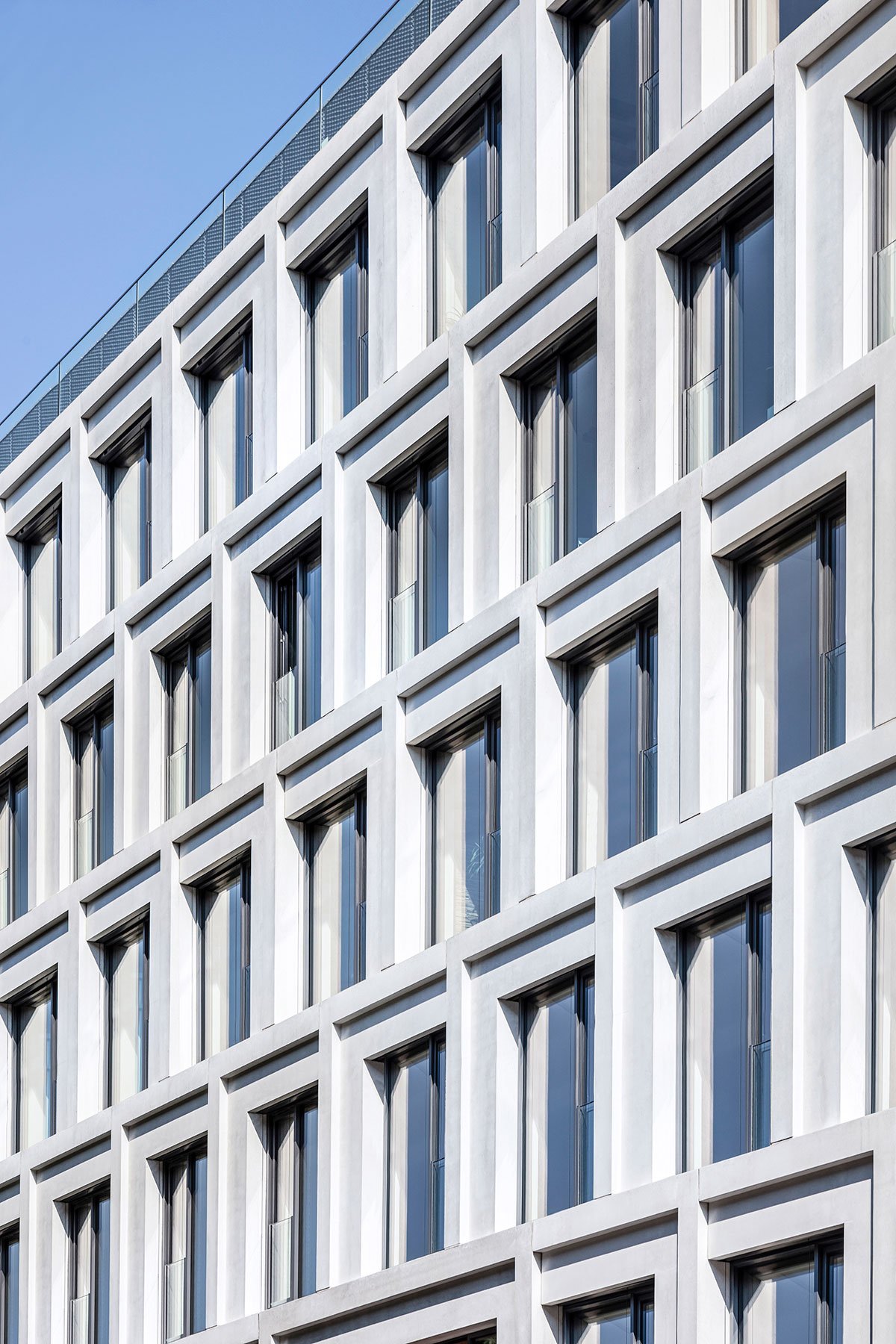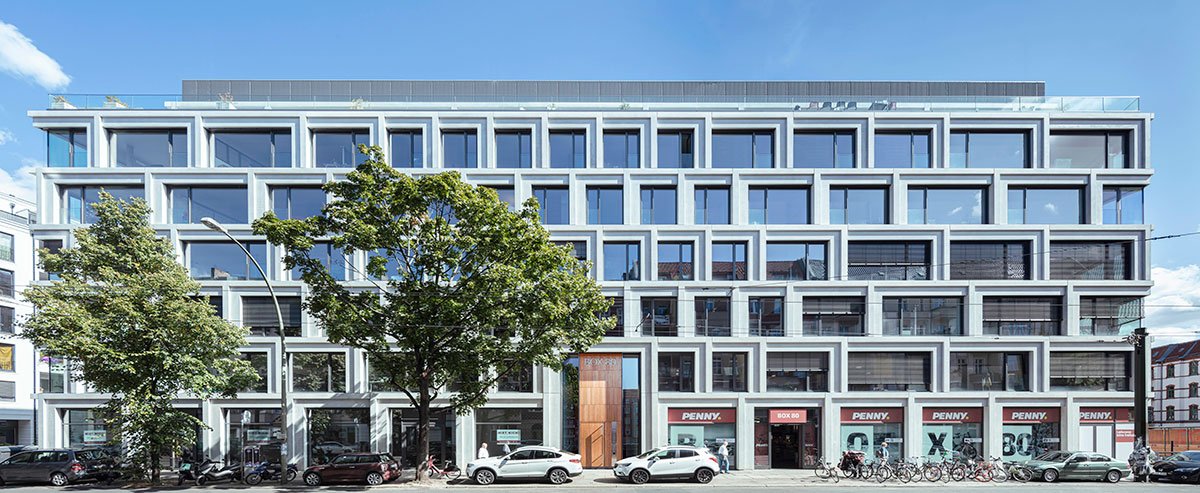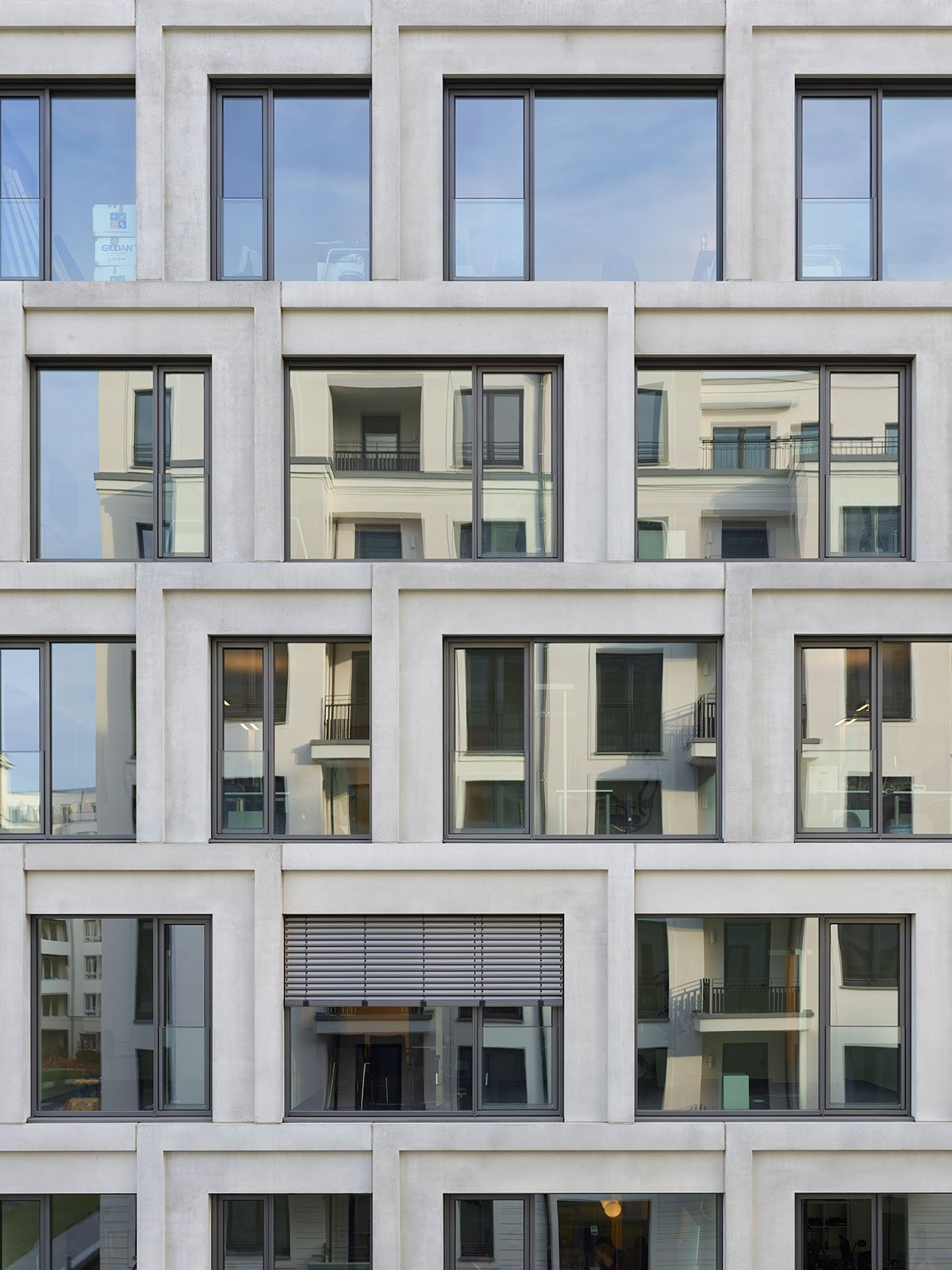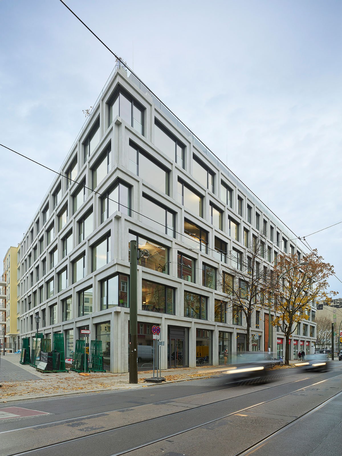 One of the hallmarks of Boxhagener Strasse is the office block BY, a large-format volume, whose expressive facade design attracts attention. The arrangement of the curtain-type prefabricated elements made of light architectural concrete, as well as their differences in scale and different alignment, provide for dynamic appearance. Here, pointed corner windows are designed as all-glass corners. Every detail is precisely worked out.