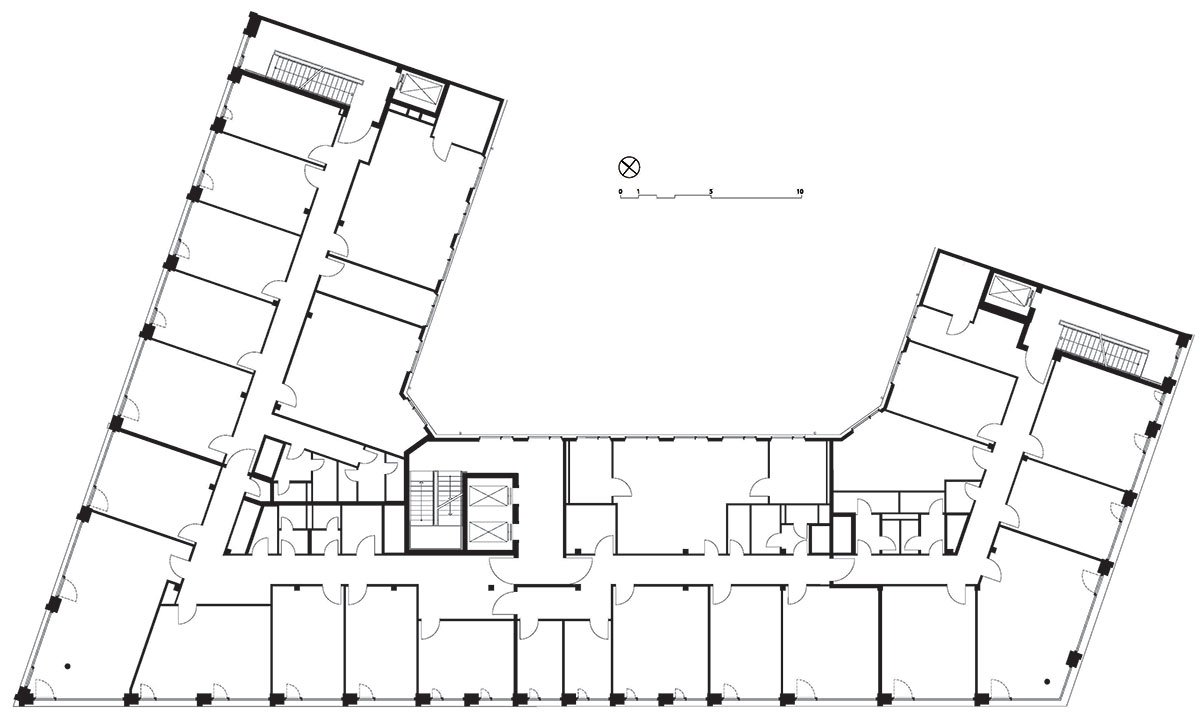 Additionally, two smaller staircases function as further exploitation and escape routes. While the building has fixed wet cell spaces, the design of the offices can be chosen according to tenants’ wishes – from one-space to open-space.