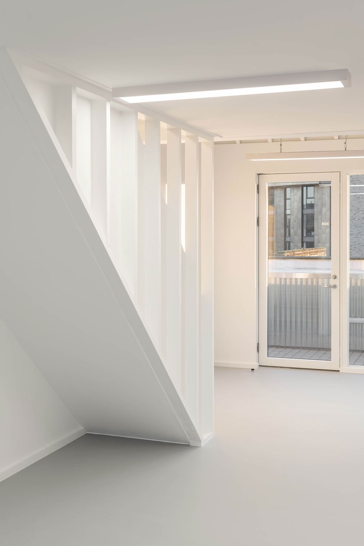 At third floor new accommodation is provided including new 40-65m2 workspaces with private mezzanine levels. They are provided in a simple pitched roof form which ensures overshadowing of the square is kept to a minimum and the new extension is largely unseen from the Bradbury Street side which falls in a conservation area. A south facing access deck behind the existing brick parapet provides the opportunity for natural cross ventilation to the new workspaces and panoramic views of London. In addition to private workspaces, a large flexible meeting and event space can be hired by tenants as well as the wider community.