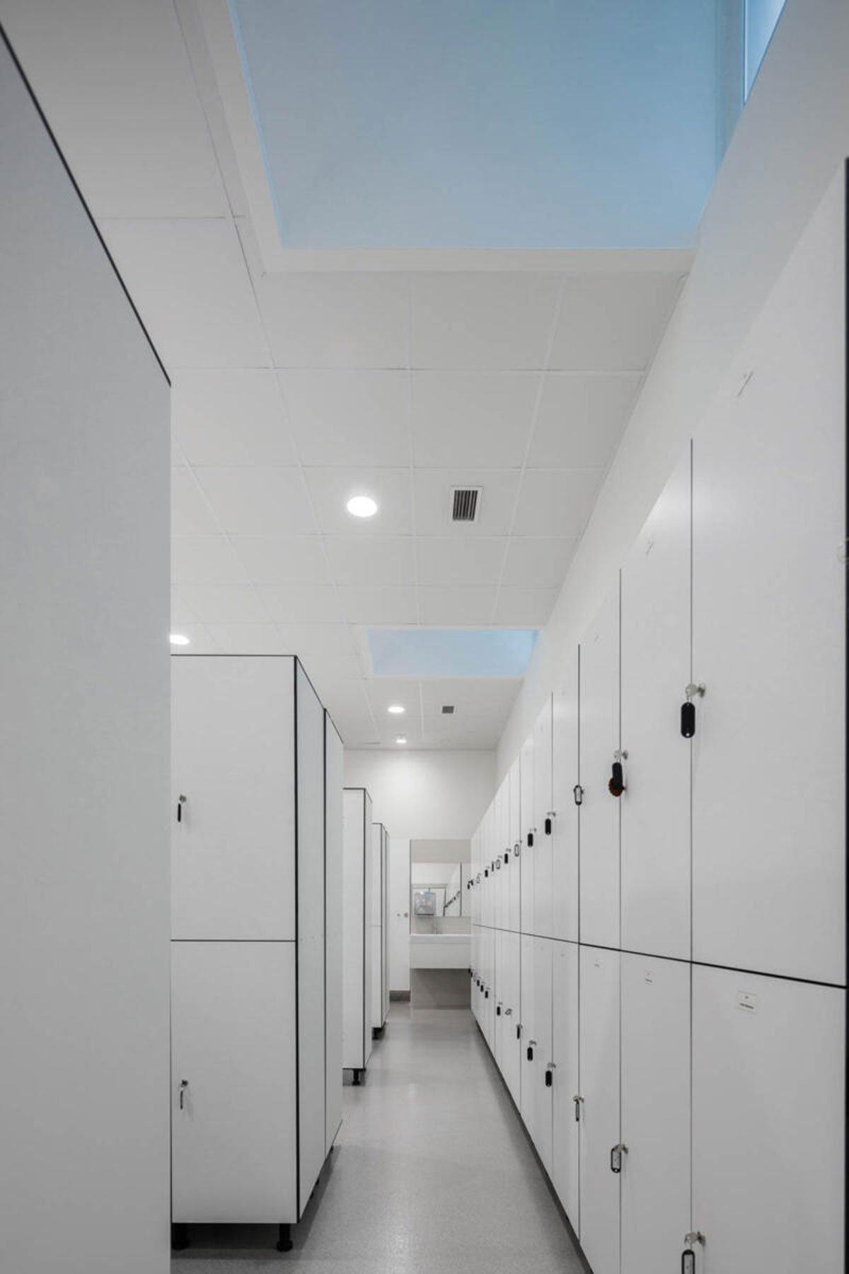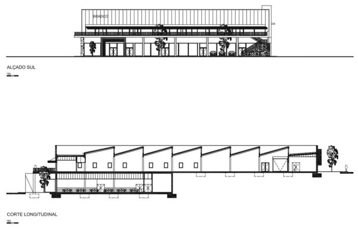 Its coverage (sawtooth) stands out throughout the production area, causing stretches of natural light, constant throughout the day in a diffuse way, its orientation being north. Still referring to the importance of the veranda in the building and in the entire landscape that surrounds it, an attempt was made as if to “extend the landscape” to make two circular slits in the slab in such a way that the vegetation on the lower floor would extend up to up. There is also a connection of the same via a stone staircase to the bottom floor.